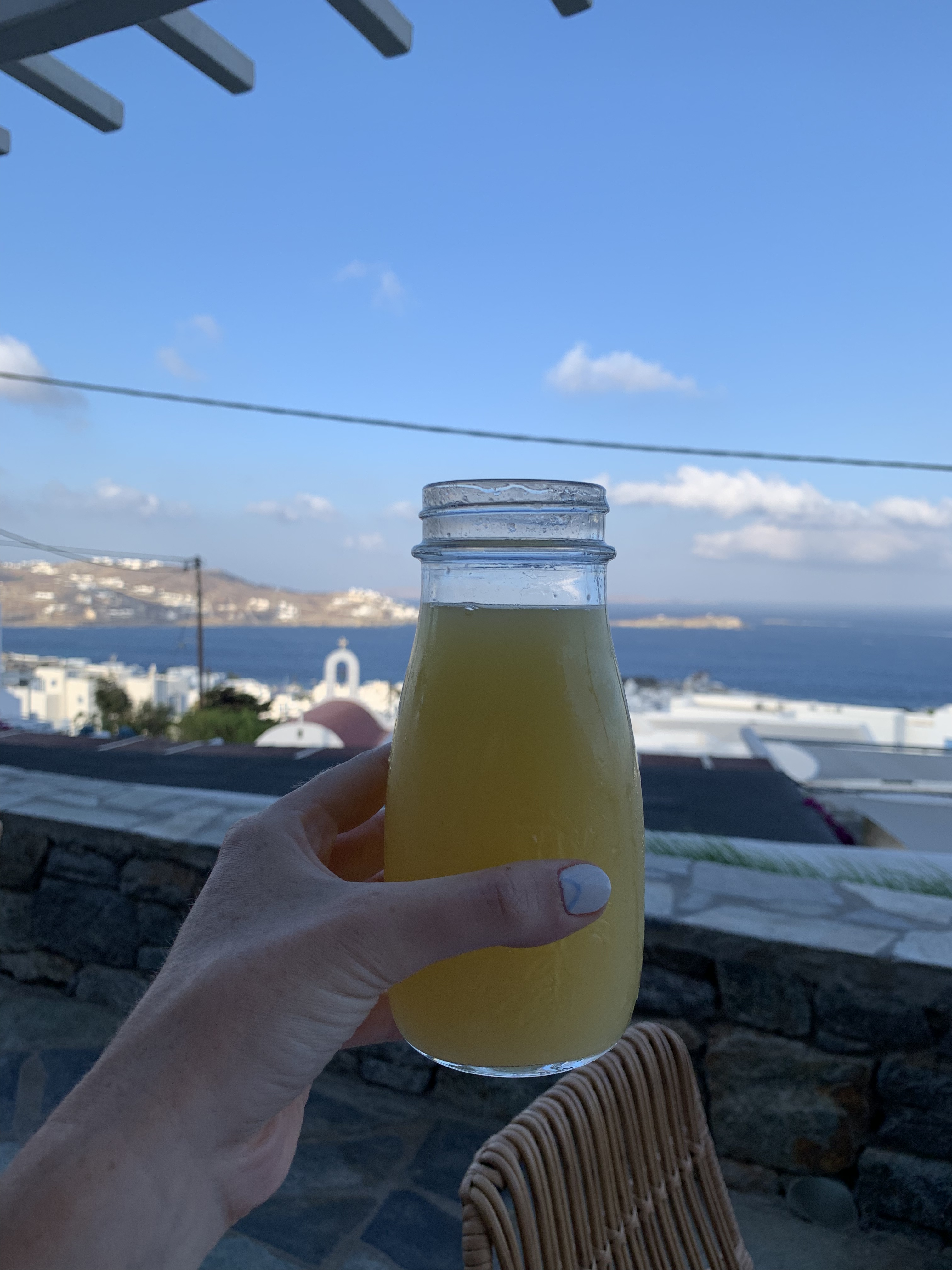 Was I exhausted when I woke up after our last night in Mykonos ? Yes. But I remembered how good that breakfast looked and was determined to eat it at least once. After some fresh pineapple juice, yogurt (with fig syrup and coconut flakes), and other buffet goodies, I ran back to the room to grab our suitcases and hop on the transfer to the ferry.