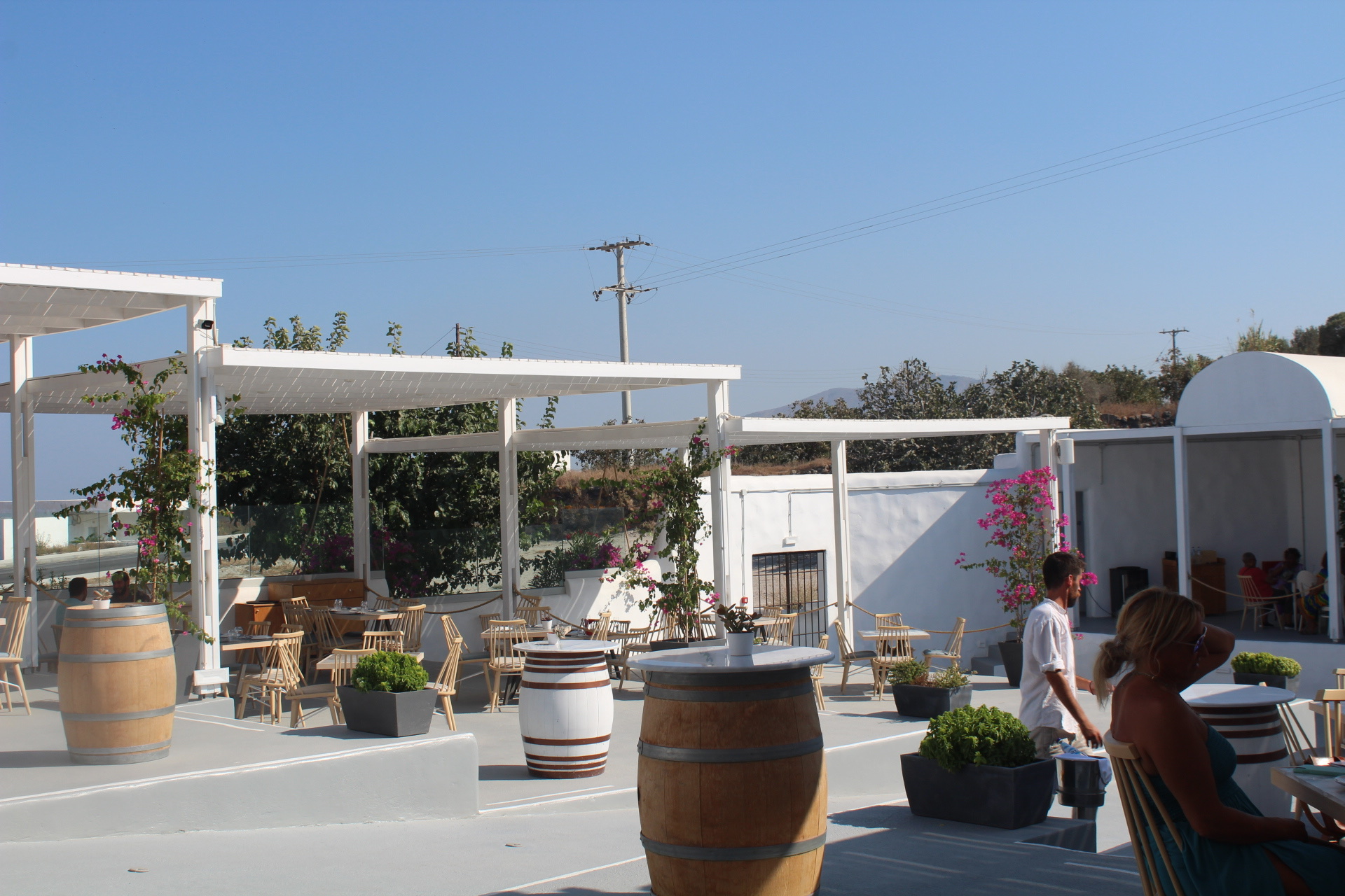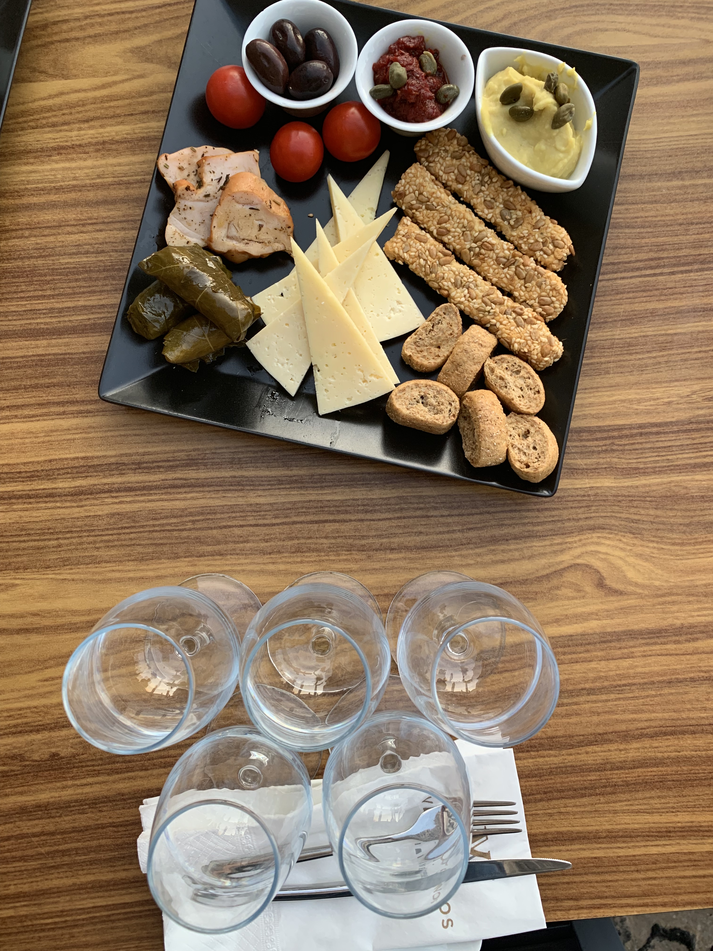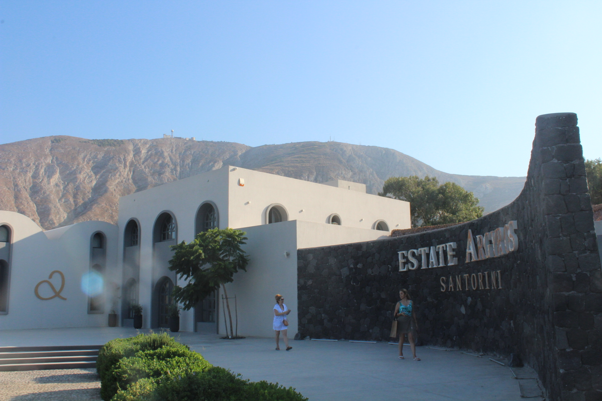 Stop number two was Estate Argyros. It’s the second largest in Santorini and one of the oldest. It’s pretty commercial and offered my least favorite wines of the tour, but it was a gorgeous space. I really enjoyed the vinsanto (dessert wine) and chocolate pairing, served with an exclusive Austrian-made chocolate that featured a jam made from the wine itself.
