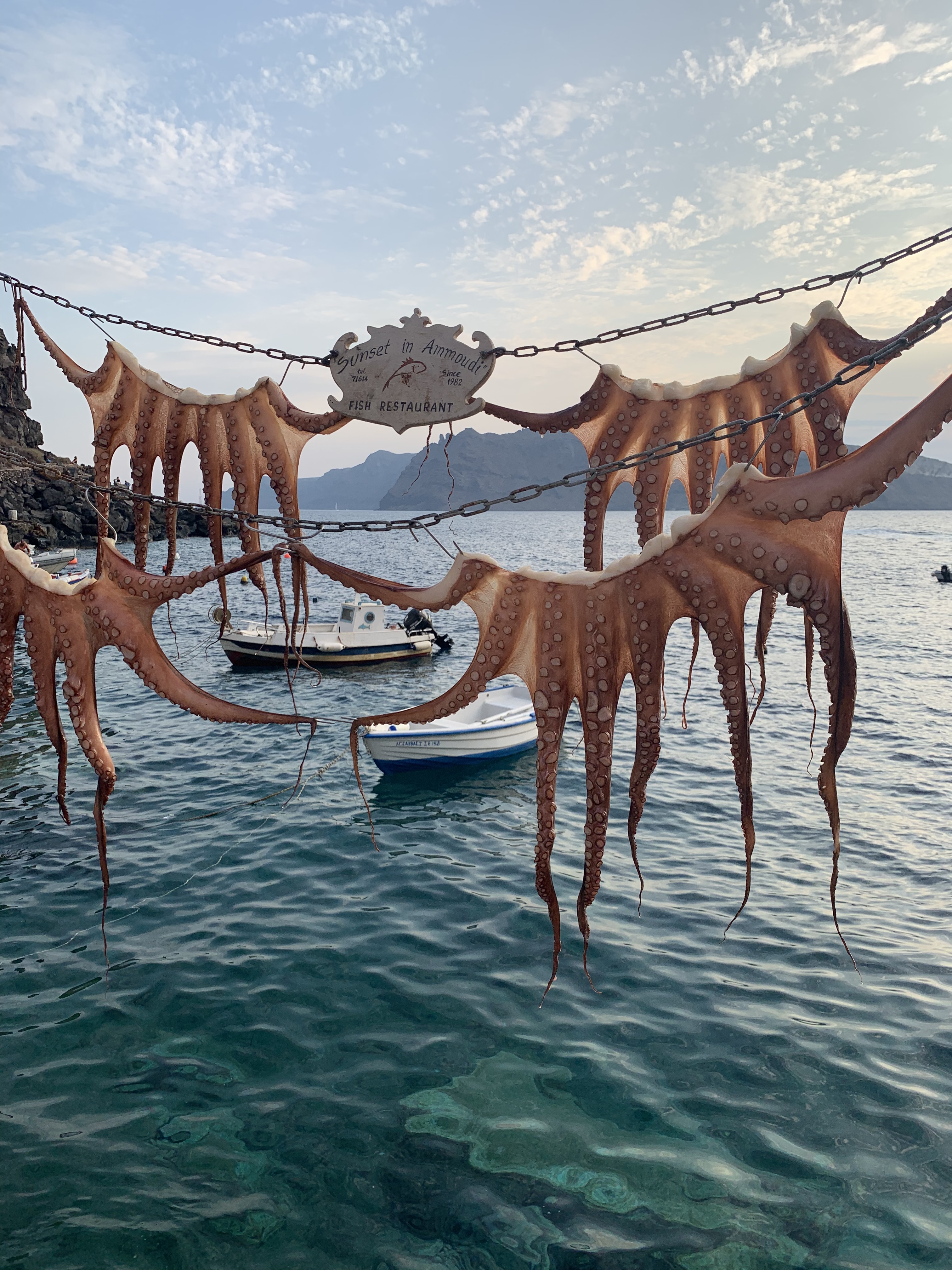 - But Santorini isn’t just about romantic restaurants! You must go to Amoudi Bay, where you can see the fish swimming as you eat their friends. It’s as fresh as it gets. There are competing opinions as to which is better: Amoudi Fish or Dmitri’s. We were very happy with Amoudi Fish and loved watching the sunset there. The famous hanging octopus looks great, but the chefs have changed and you’ll find better elsewhere. Your best bet is just to ask what’s fresh.