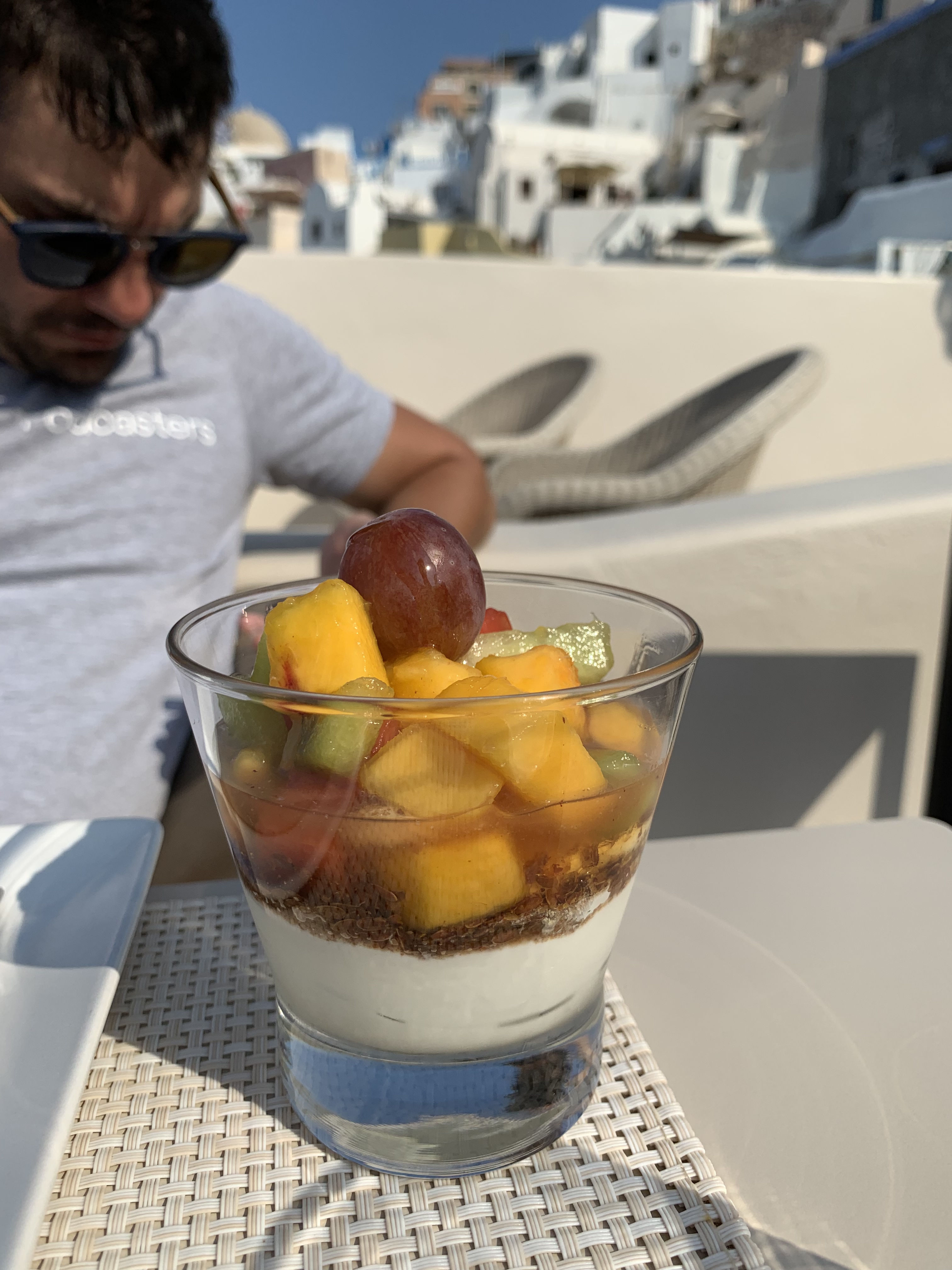 After the photos we grabbed breakfast. Since our hotel is really just 7 apartments, the breakfast, on a roof deck (the pink Instagram hotspot of Kastro’s) , has a limited menu because there’s a very tiny kitchen and they can’t carry much up the perilous steps. At first I thought I’d miss the big European buffet…but then our food arrived. So fresh! And coffee/fruit juice/smoothies however we wanted! My Traditional Greek (hard boiled egg, feta, and balsamic) was perfect.