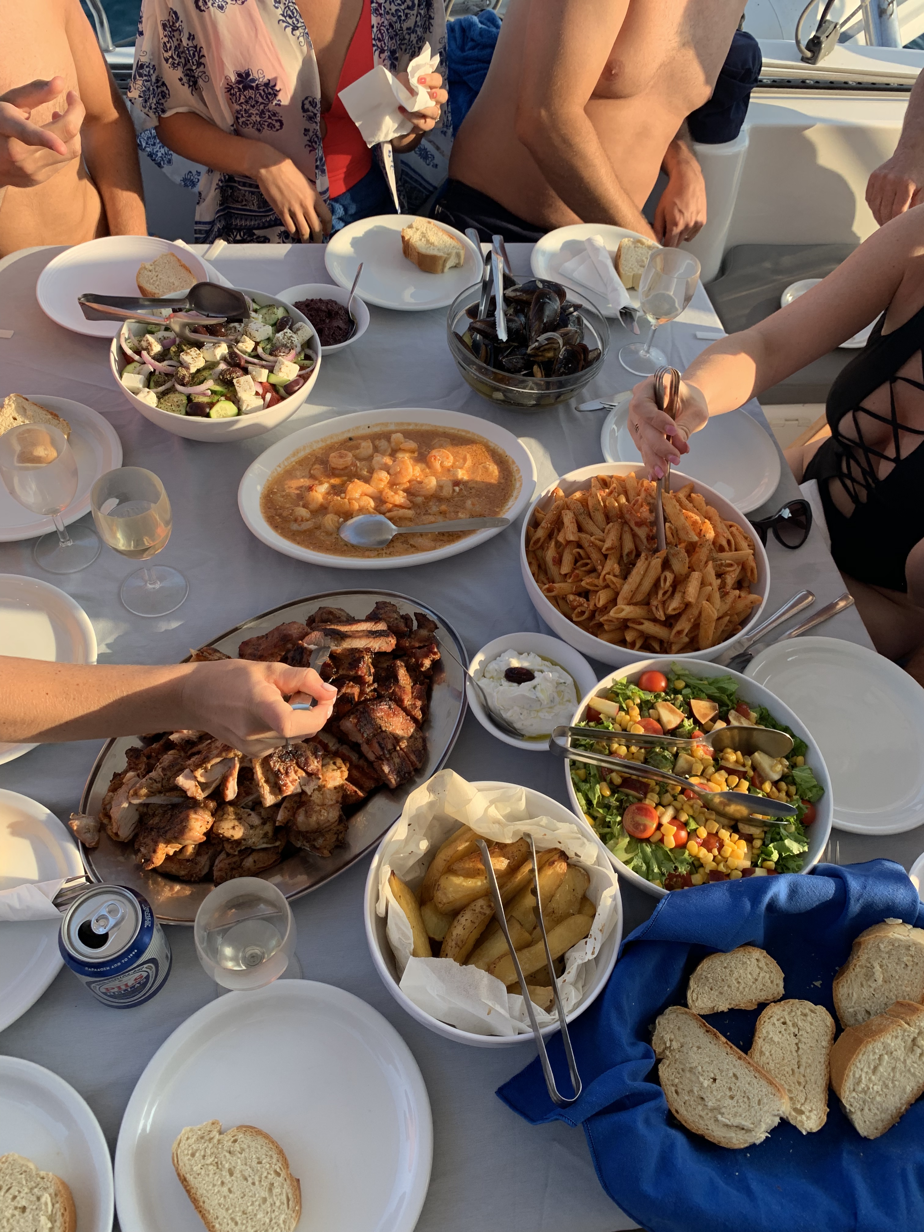 The beat part of the boat tour was obviously the free flowing wine and the on-board meal. There was bread with olive tapenade and tzaziki. Penne pasta. Shrimp. Mussels. Two salads. Grilled chicken and pork. A feast!