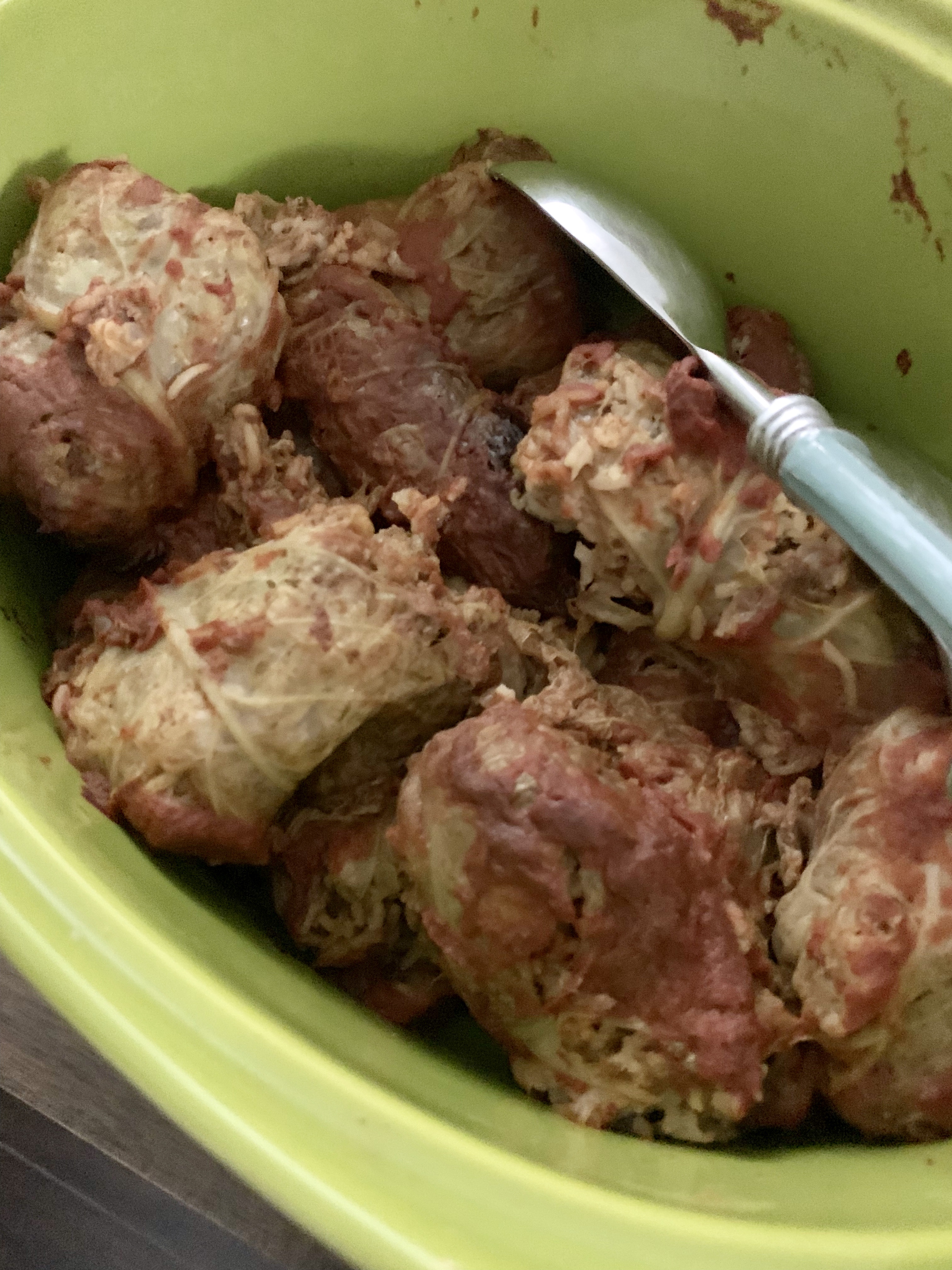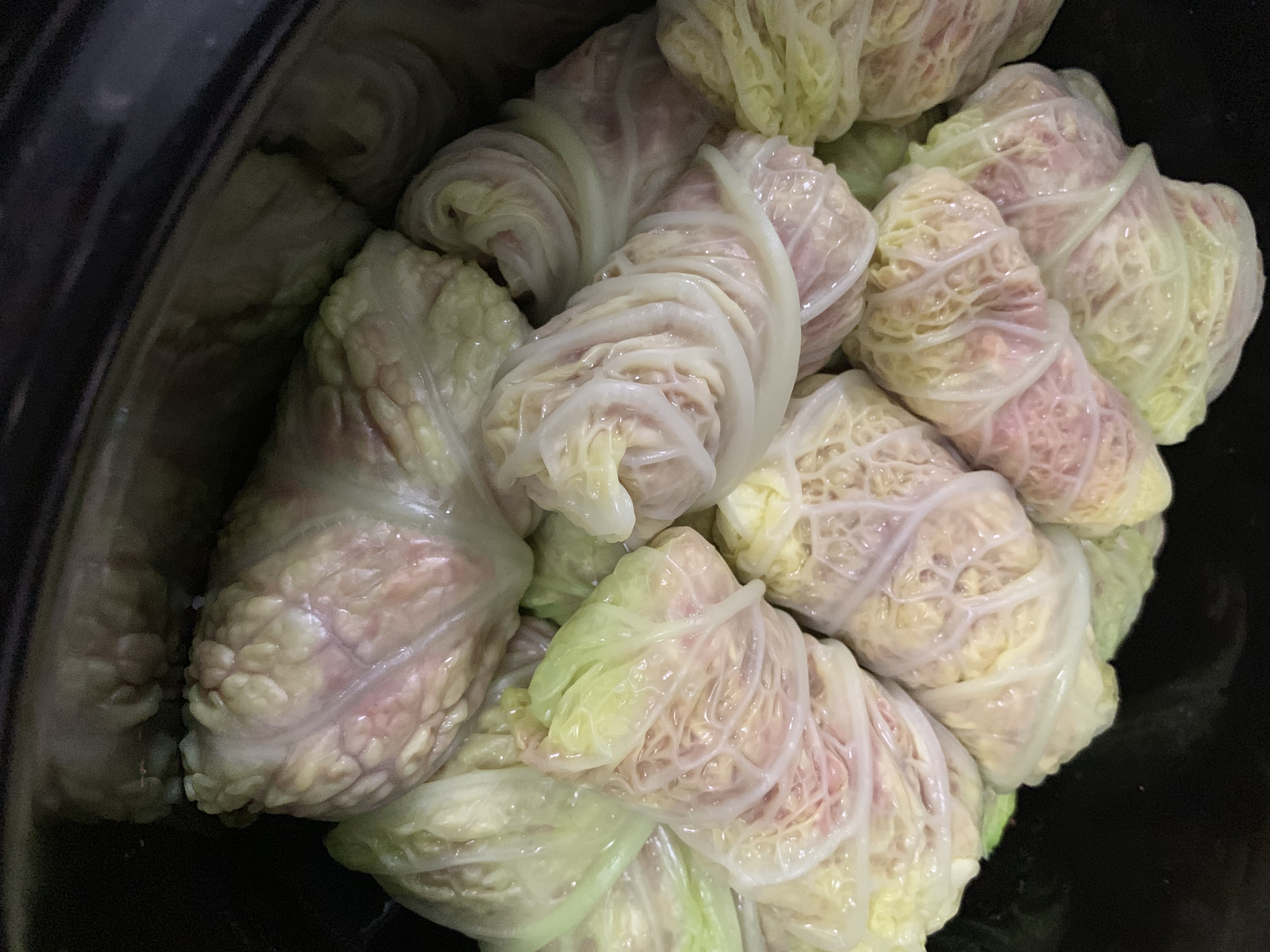 Read the recipe yourself, but basically you’ll boil a head of cabbage for just a couple of minutes so you can easily peel off the leaves and have them pliable enough for rolling. Separately, you’ll make your filling: ground meat, uncooked rice, chopped onion, some liquid (tomato sauce or broth), and some garlic. You’ll roll the filling inside the leaves like a bunch of mini burritos and layer in a crock pot. Top all of them with a sauce made with tomato sauce, tomato soup, worchestershire, and paprika. Cook on low for 7 hours or high for 4 hours.