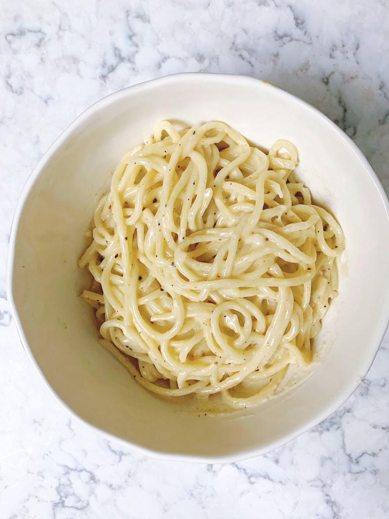 I followed Bon App’s recipe pretty much exactly, though I used only Grana Padano when it came to cheese variety. Not only is it easy, it comes together so quickly. You just need to be a bit watchful. Basically, you boil pasta while also melting butter with fresh cracked pepper. When the pasta is done, you’ll add some of the starchy pasta water and then the pasta itself. Then the cheese. Toss toss toss. That’s it. Honestly, just follow this recipe and you’ll be good.