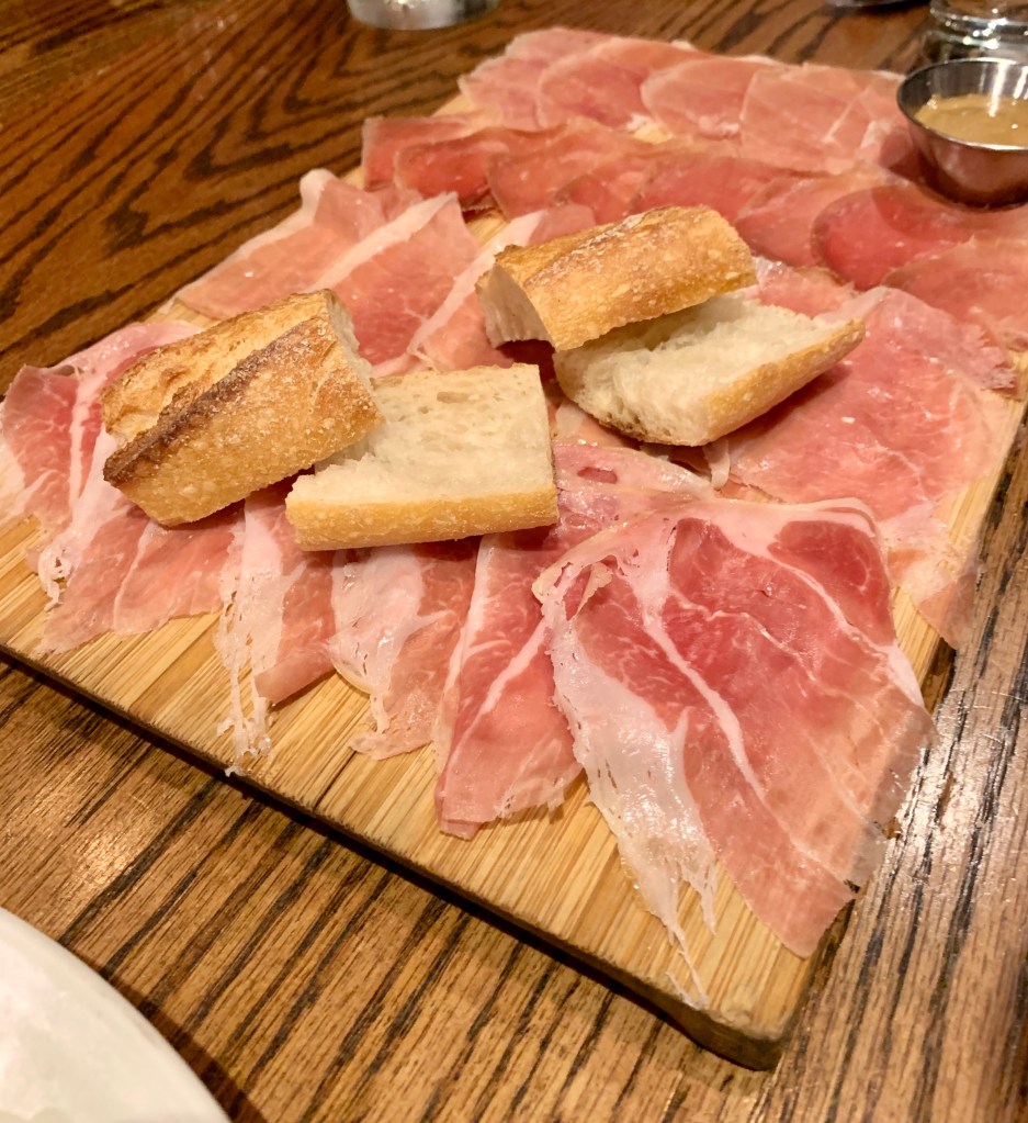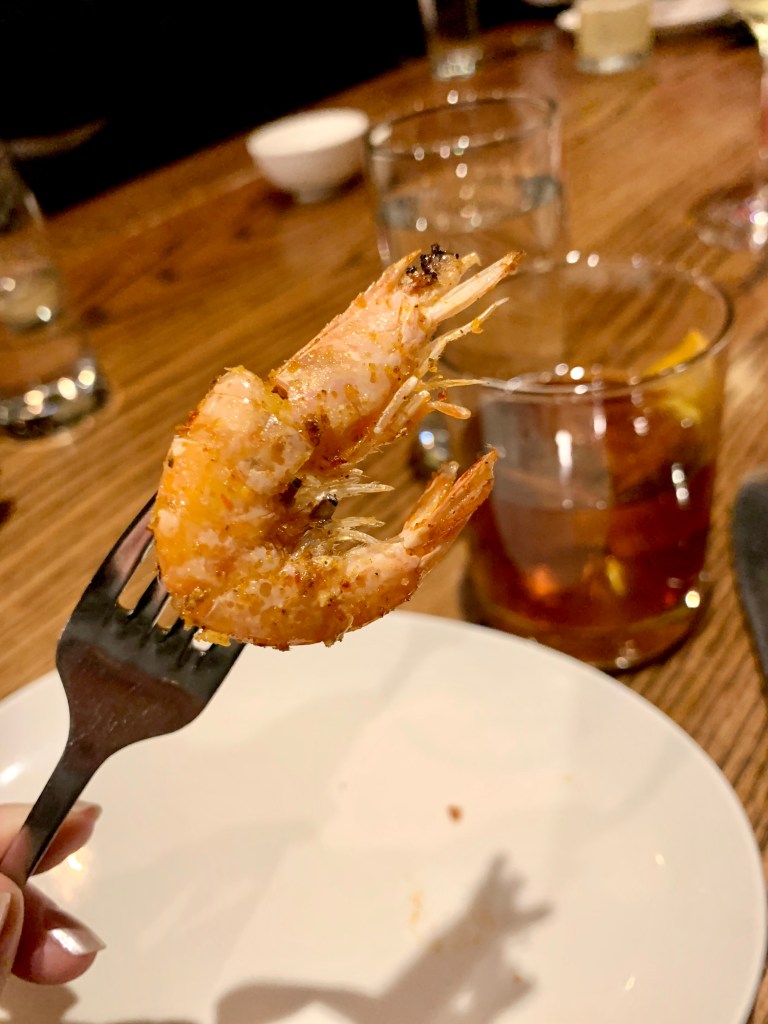 Next up for apps, we got a sampler of cured hams and let me just say that any restaurant that has an entire section of the menu devoted to “country ham” is good in my book. We also started with an order of the fried head-on shrimp in spicy chili salt. I’ve never eaten anything like this before – they’re small and crispy and you eat the whole thing, head, shell, and all. If you can get past that part (I could) it was a great snack. Can we make head-on crunchy shrimp the new potato chips?