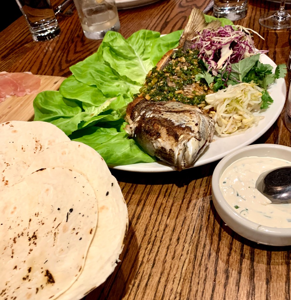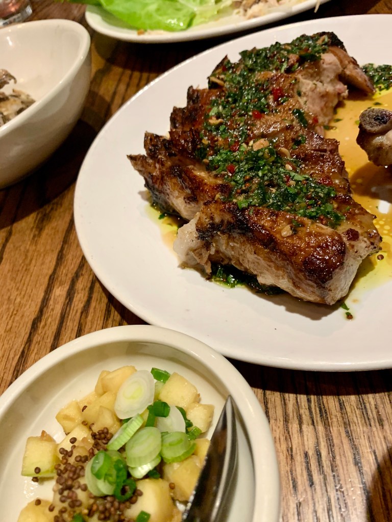 Everything here is very sharable, including the mains, of which we ordered the pork chop (with mutsu apple, perilla seed, and doenjang) and the whole roasted fish (served as tacos or lettuce wraps with ginger-scallion, bean sprouts, and herbs). Both of these large items were really really good and very filling. The pork was very tender and the fish was seasoned beautifully.