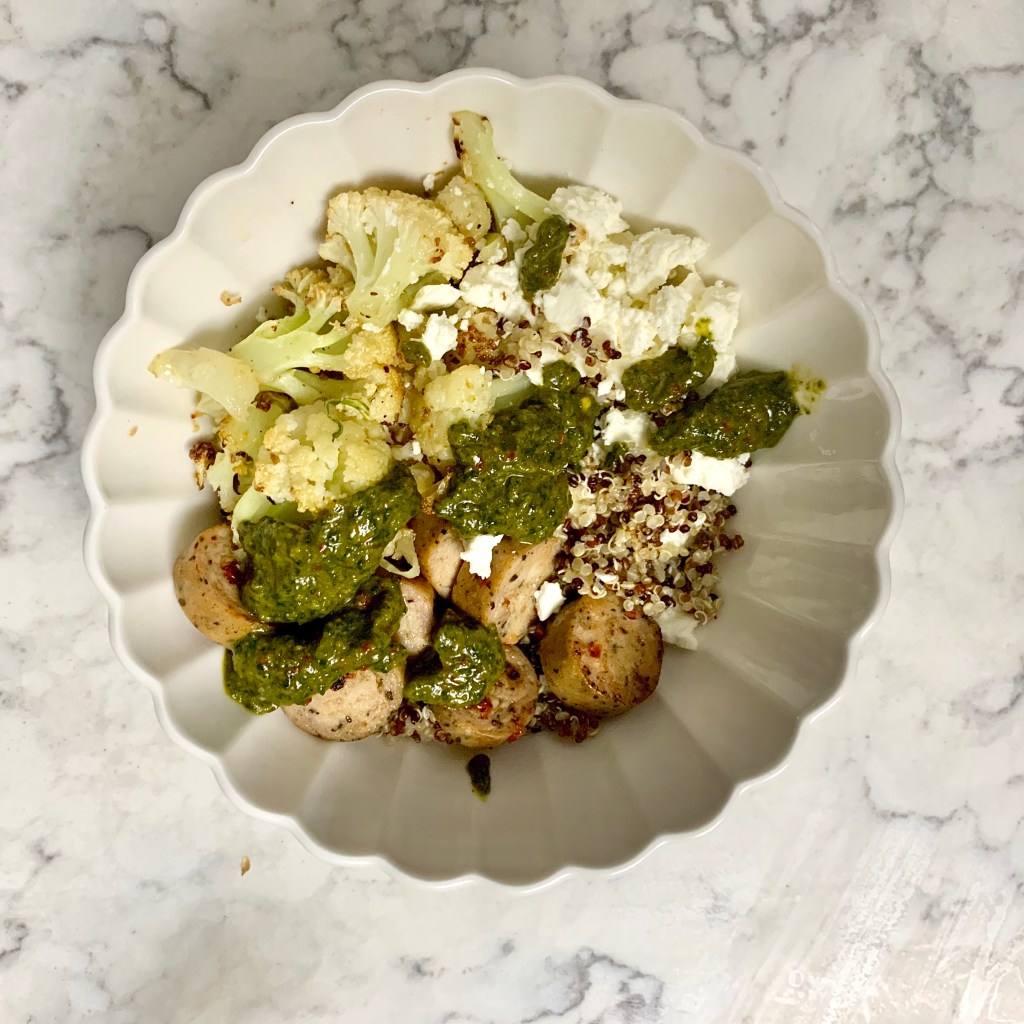 Start by cooking a batch of quinoa. While it’s cooking, roast some cauliflower with oil and whatever seasoning you have on hand. Those two items should be done around the same time, probably about 25 minutes. When your quinoa/cauliflower is almost done, sauté a package of sliced chicken sausage in a pan til it’s warmed through (I used the sundried tomato variety). For the finishing touches, crumble in some feta and drizzle with Trader Joe’s zhoug sauce.