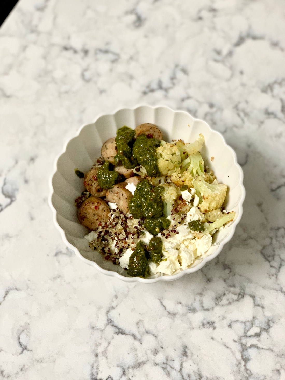 Start by cooking a batch of quinoa. While it’s cooking, roast some cauliflower with oil and whatever seasoning you have on hand. Those two items should be done around the same time, probably about 25 minutes. When your quinoa/cauliflower is almost done, sauté a package of sliced chicken sausage in a pan til it’s warmed through (I used the sundried tomato variety). For the finishing touches, crumble in some feta and drizzle with Trader Joe’s zhoug sauce.