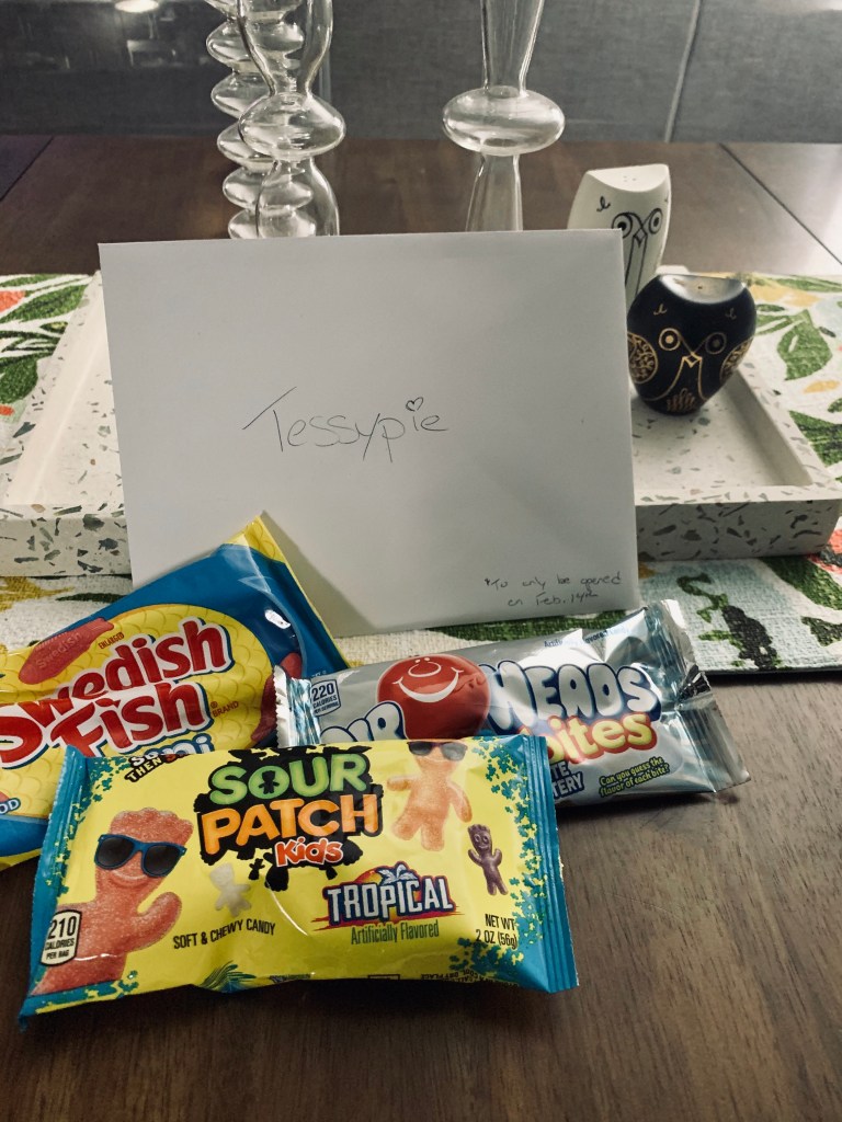 Years ago, my Mom started arming us with “nosh n fly,” i.e., snacks for flights. I came home on Tuesday to a Valentines card that I get to open while I’m away and some of my very own nosh n fly for the trip. Makes the early wakeup sting a bit less!