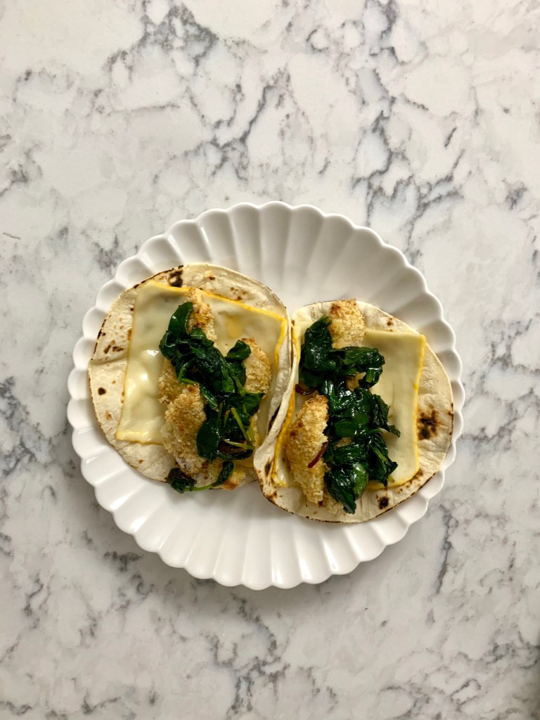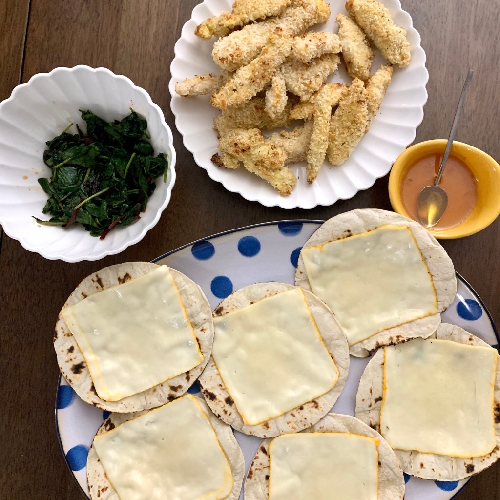 Start by making your crispy chicken. Using flour, beaten egg, and panko, bread chicken tenders and cook them in a 425 oven. Feel free to flavor the panko crumbs with garlic salt and onion salt. I did. I actually cut my tenders into even smaller/thinner pieces so they only needed 15 minutes in the oven (flipping halfway through). 15 minutes is exactly enough time to get your toppings together. I wilted some greens down with olive oil and paprika. Collards, baby kale, and spinach all work . (Or, in my case, I used a package that combined all three.) I also made some hot honey by stirring hot sauce into honey and microwaving it for a few seconds so it’s extra easy to drizzle and soak into the chicken. You can buy hot honey…this is easier. To assemble, top a warm tortilla with a slice of munster cheese so it starts to melt, then add in your chicken, greens, and a drizzle of honey.