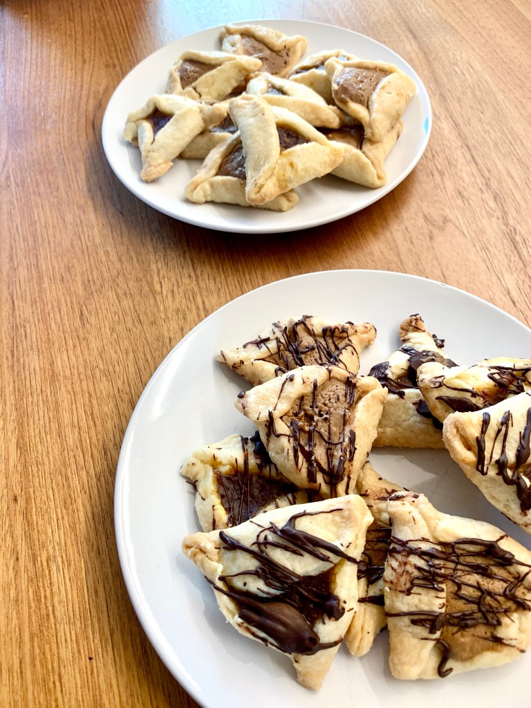 These hamantaschen can be made with exactly two ingredients. TWO. I remember my mom and grandma spending hours in the synagogue kitchen making thousands of cookies with the Sisterhood to be sold to the community. Making and rolling out that dough is certainly time consuming. For these hamantaschen, simply use pre-made pie crust (found in Trader Joe’s freezer section or other grocery stores’ refrigerated section). Cut the dough into circles (I didn’t have a cookie cutter so I just used the lid from one of my jars of filling. For filling, I made two versions: Trader Joe’s cookie butter and Trader Joe’s pumpkin butter. Pumpkin butter isn’t in season (I had it leftover), but there are plenty other things you could use for a funky fruit/jam filling. I would love to try one of Sqirl LA’s jams (like this black mission fig and red wine or rhubarb kumquat) or a thick dulce de leche (like this). Anyway, after cutting out your dough circles, place a 1/2 tsp of the filling in the center of each, fold up three sides to form a triangle and pinch closed. Note: do not overfill. they’ll open up in the oven and taste fine but won’t look good and will be impossible to transport. Bake in a 350-375 oven for about 15 minutes. Just check in and remove them when the dough starts to get golden brown. I melted some dark chocolate morsels in the microwave and used a spoon to drizzle it over half the cookies to take them up a notch. When I brought them into the office, the chocolate drizzled ones went first, naturally. Chocolate isn’t necessary and takes these to 3 ingredients (boo hoo) but doesn’t really increase the difficulty factor.