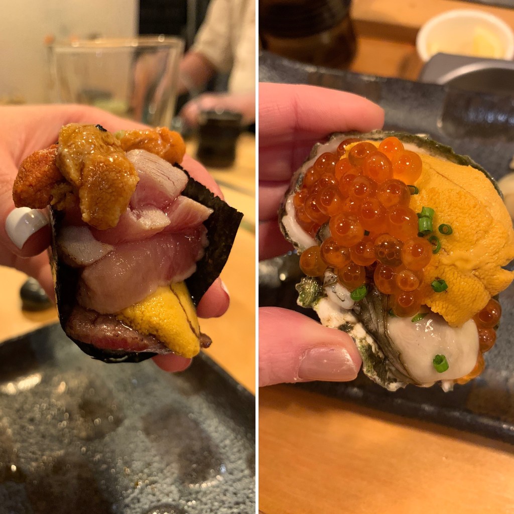 Now for these add-ons. There are about six special items you can tack onto the end of your meal. They’re most famous for the Big Mac. It’s chopped toro, seared toro, wagyu, and two kinds of uni piled high into a folded piece of seaweed. It’s $18 for that one piece. Would I do it again? YES. Rebekah and I both got that and one of the other special add-ons. She went with the Whitney, which included salmon and an egg; I got the Three Amigos, which was an oyster, roe, and uni. Loved it. This meal included lots of uni, by the way. And I love me some uni so I was very happy.