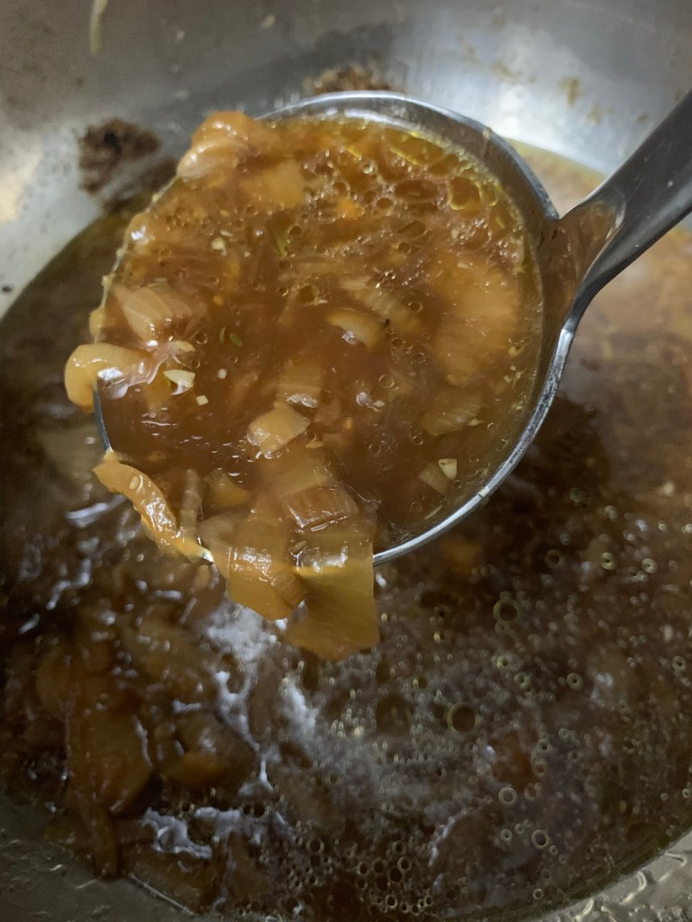 My original idea was to activate a slow cooker version of this soup that I pinned ages ages ago, where the onions caramelize right there in the crock pot with no intervention from the chef. But when I went to start it that morning, I realized I needed to have begun the process the night before. I had to pivot so I did what anyone would do: I googled. I figured one of the top recipes that popped up in my search had to be good. Why Did I choose this recipe in particular? Because it called for vermouth, which I had on hand, rather than sherry/brandy, which I did not.