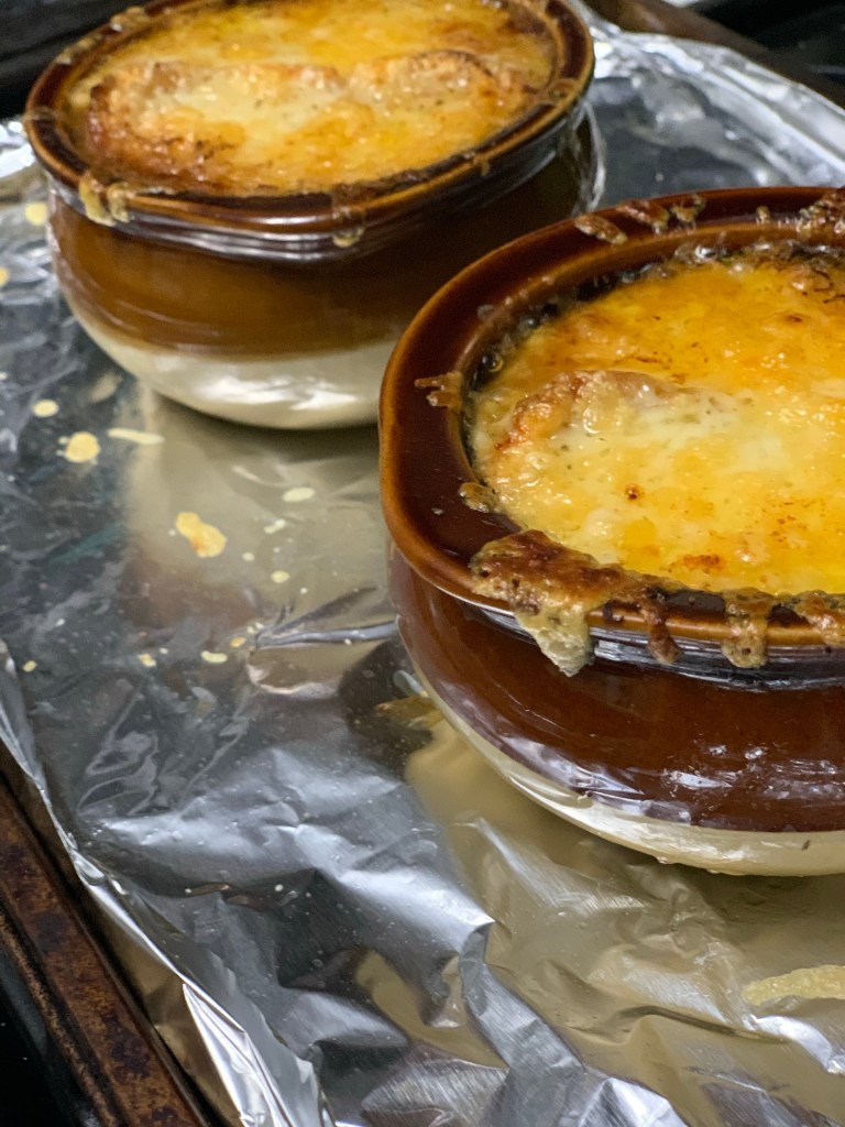 I bought these crocks years ago, solely so I could make French onion soup, and this is the first time using them. You can find them for super cheap and if you ever want to make this soup, it’s worth it. It is simply not the same if you can’t melt the cheese in the oven like this. A warning: the crocks get VERY hot in the oven so you’ll need to handle them with pot holders when they come out and be careful not to sit them on top of plates that could crack under the heat. (I put these directly onto our placemats.) This was restaurant quality and if I realized how easy it was to make, I’d have made it long ago. And there’s something pretty special about serving this at a dinner party, where every guest gets their own little crock of soup. When this quarantine nonsense is over, that’s definitely something you should plan to do.