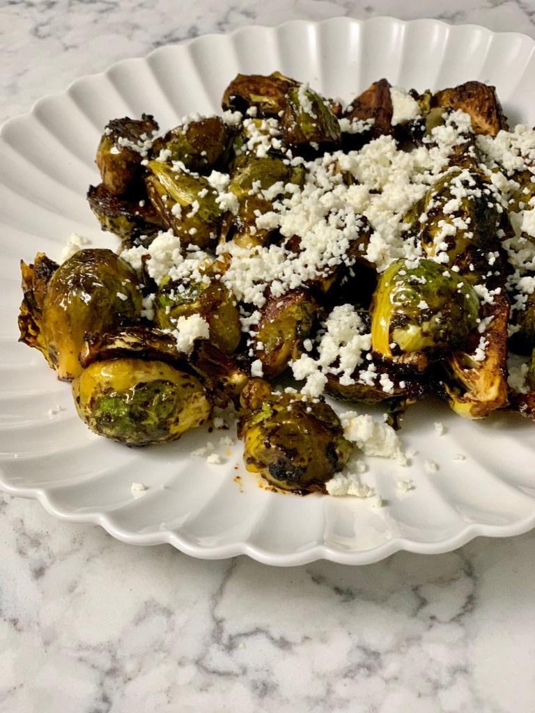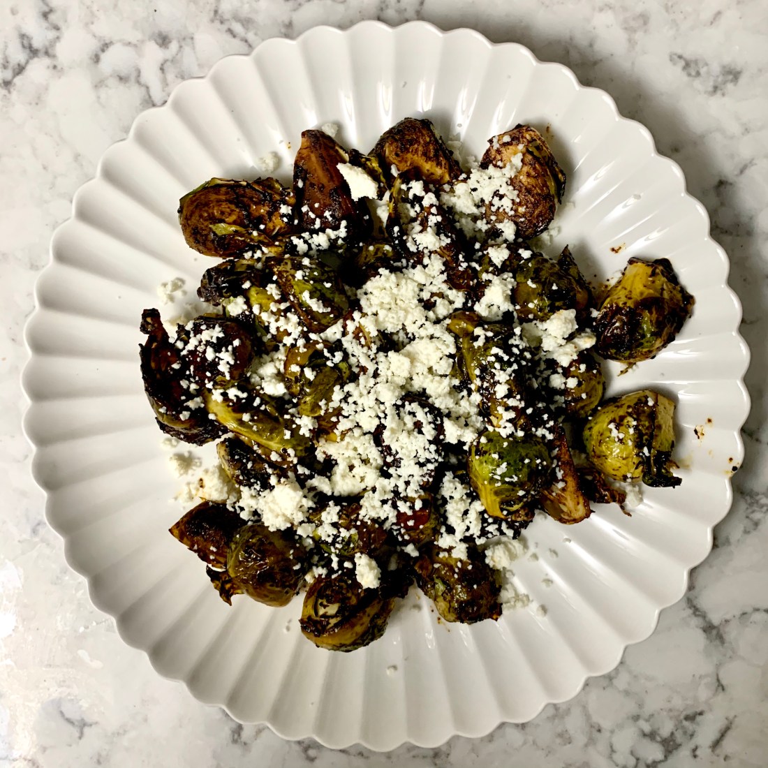 Basically, you’re just tossing the vegetable in a vinaigrette and roasting it. Simple as that. For my mole vinaigrette I used mole negro paste, apple cider vinegar, brown sugar, olive oil, and garlic powder. I didn’t measure anything out, just tasted it until it seemed right. I roasted the halved brussels sprouts as I normally would and then topped them with queso fresco.