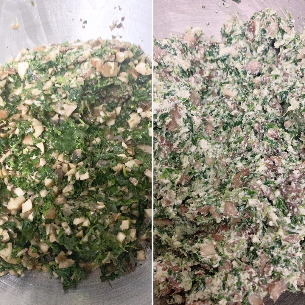 The process for the pasta is the same: mix 2 c. flour, 3 eggs, 1 tbsp olive oil, and 1 tsp salt by hand to make a “shaggy dough”. Then mix for 10 minutes on low speed with the dough hook and let sit for 30 minutes. I cracked a good bit of lemon pepper into my dough as well to test out a flavored pasta. While The dough is resting for 30 minutes, make your filling. I defrosted frozen spinach in the microwave (1 box) then wrung it out and chopped it up a bit more. I mixed with one package of sliced cremini mushrooms that I sautéd with garlic and [dried] thyme. I also chopped the mushrooms up as finely as I could after sautéing them. Fold in 1/2 lb of fresh ricotta and a solid handful of fresh grated parmesan. Add some salt. That’s your filling. When it comes time to serve, use whatever sauce you want. A creamy parmesan sauce would be good, as would garlic butter. I went with a pink sauce by warming jarred marinara with some half and half and some crushed red pepper flakes. Topped with more parmesan, of course.