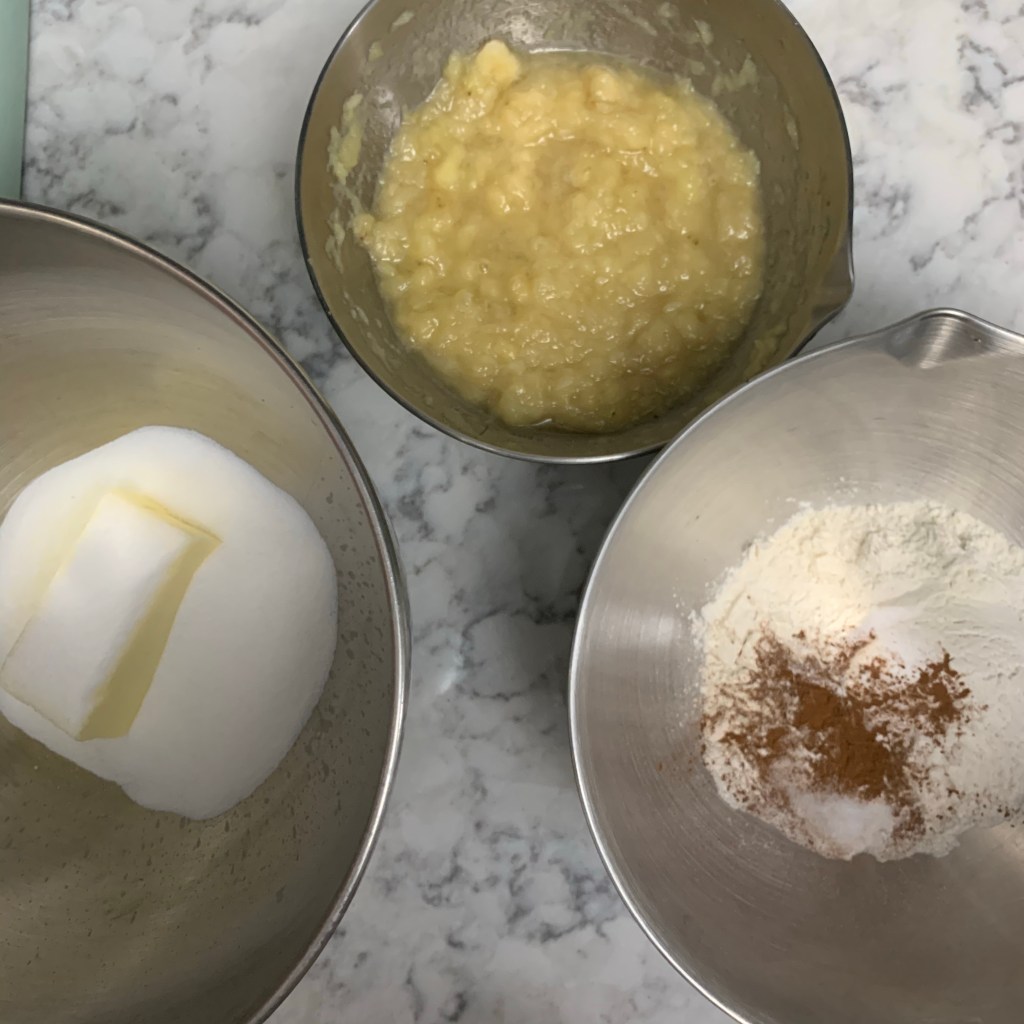 Get your oven preheated to 350. To make this, you’ll need the bowl to your mixer plus two others. In the first of those “other” bowls, mash two bananas and mix with 1/4 c. crushed pineapple in juice. In the second “other” bowl, whisk together 1 c. flour, 1/2 tsp baking powder, 1/2 tsp baking soda, 1/2 tsp cinnamon, and 1/4 tsp salt. While the recipe didn’t call for it, I added ground ginger and cardamom. Now in the mixer bowl, blend 1 stick unsalted butter (room temp) with 1/4 c. sugar. Beat for 3-4 minutes then add two eggs, one at a time. Then add the dry ingredients, bits at a time, still beating. Finally, add the banana/pineapple mixture and beat slowly just til it’s all combined. I use the lowest setting to beat everything. Bake those suckers for 18-20 minutes.