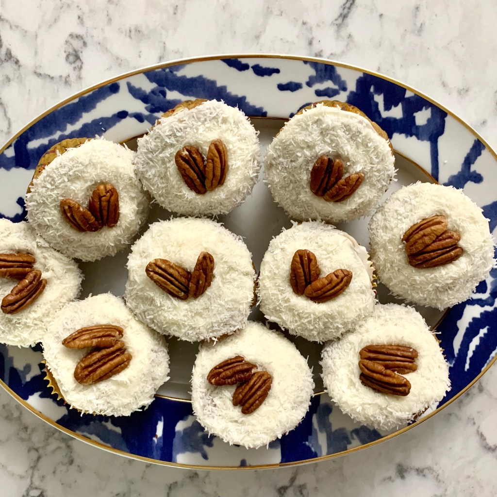 For the frosting, I made a traditional cream cheese frosting. For my 12 [large] cupcakes, I made a smaller batch of frosting because I’m not big on frosting in general. 4 tbsp butter (1/2 stick) + 4 oz cream cheese + 2 c. powdered sugar + 1 tsp vanilla. Beat it all together and you’ll have the frosting with just the right thickness and tang. Note: traditionally, hummingbird cake has pecans and sweetened coconut folded into the batter. I don’t like nut’s in cakes so I use them as garnish on top of that traditional cream cheese frosting. I also used unsweetened coconut because, well, the store was out of the other stuff. Honestly, the unsweetened kind may have been better. It cuts some of the sweetness of the frosting, and I’m not big on super sweet or frosting. Simply spread some frosting on top of a cupcake and don’t worry about piping it on all pretty because step 2 is to roll it in the unsweetened shredded coconut you’ve poured on a plate. Top with pecans.