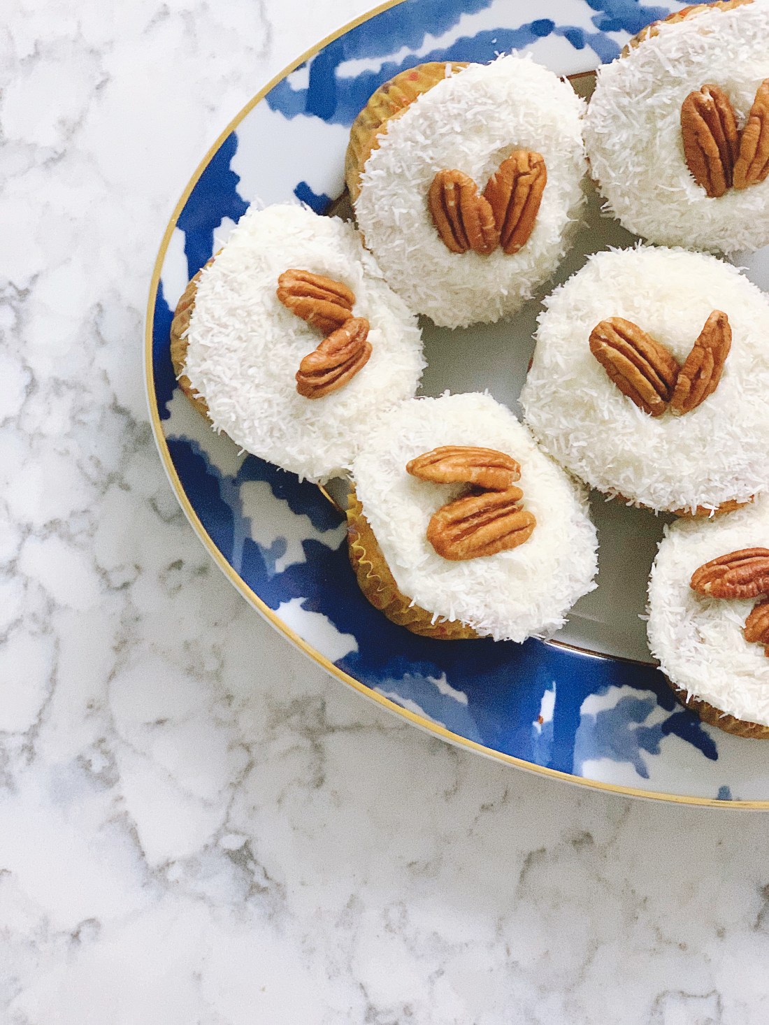 For the frosting, I made a traditional cream cheese frosting. For my 12 [large] cupcakes, I made a smaller batch of frosting because I’m not big on frosting in general. 4 tbsp butter (1/2 stick) + 4 oz cream cheese + 2 c. powdered sugar + 1 tsp vanilla. Beat it all together and you’ll have the frosting with just the right thickness and tang. Note: traditionally, hummingbird cake has pecans and sweetened coconut folded into the batter. I don’t like nut’s in cakes so I use them as garnish on top of that traditional cream cheese frosting. I also used unsweetened coconut because, well, the store was out of the other stuff. Honestly, the unsweetened kind may have been better. It cuts some of the sweetness of the frosting, and I’m not big on super sweet or frosting. Simply spread some frosting on top of a cupcake and don’t worry about piping it on all pretty because step 2 is to roll it in the unsweetened shredded coconut you’ve poured on a plate. Top with pecans.