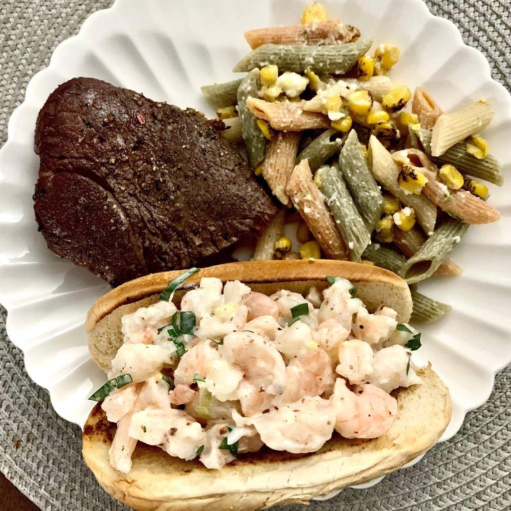 It ended up raining so we ended up eating inside, which is far less exciting on a Friday night but just as tasty. Steak, shrimp rolls, and a fun pasta salad?! This is an ideal summer supper and I’m honestly drooling as I plan when I can replicate it.