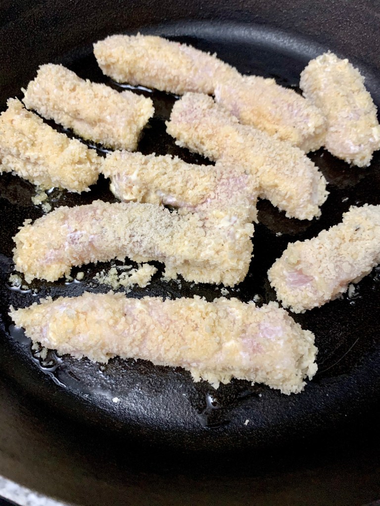 Start by slicing a swordfish steak into sticks. You can also cut into cubes for nuggets, but that will make this process a bit longer. Next mix your marinade of mayo, miso paste, and cracked pepper. The ratio should be about 2 parts mayo to 1 part miso. I’m not entirely sure. I started mixing…tasted…added more mayo…tasted again. Toss the fish in the bowl of sauce until all sides are covered. you can let it sit there for a bit, soaking up the flavor, if you’d like; there’s no acid in this so it won’t cause the fish to cook at all. When you’re ready to get after it, roll the fish in panko. In a greased cast iron skillet, brown the sides of the fish so the bread crumbs start to get a bit golden. Then, transfer to a 400 oven and bake for 4 minutes.