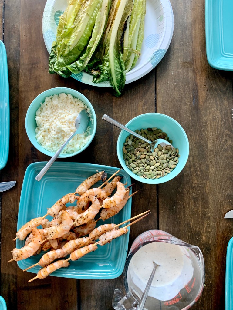 This salad comes together super quickly, mostly because I decided not to make the dressing from scratch. Simply take bottled caesar dressing and doctor it up by adding minced jalapeñ, chopped cilantro, and cumin to taste. Your dressing is done in seconds. For the lettuce, slice romaine hearts in half but leave that core in tact on the bottom so lettuce leaves will stay together. Drizzle with olive oil, salt, and pepper and throw on the grill. It will take less than 10 minutes to cook. When it looks about halfway done, toss some shrimp on the grill as well (they only take a few minutes). The shrimp can also be simply seasoned with olive oil, salt, and pepper, but you could also add some cayenne, cumin, and garlic powder if you’d like an extra pow of flavor. To build your salad, take a romaine half, drizzle with your dressing, and top with the shrimp, cotija cheese (instead of the usual parm) and pepitas (instead of the usual croutons).