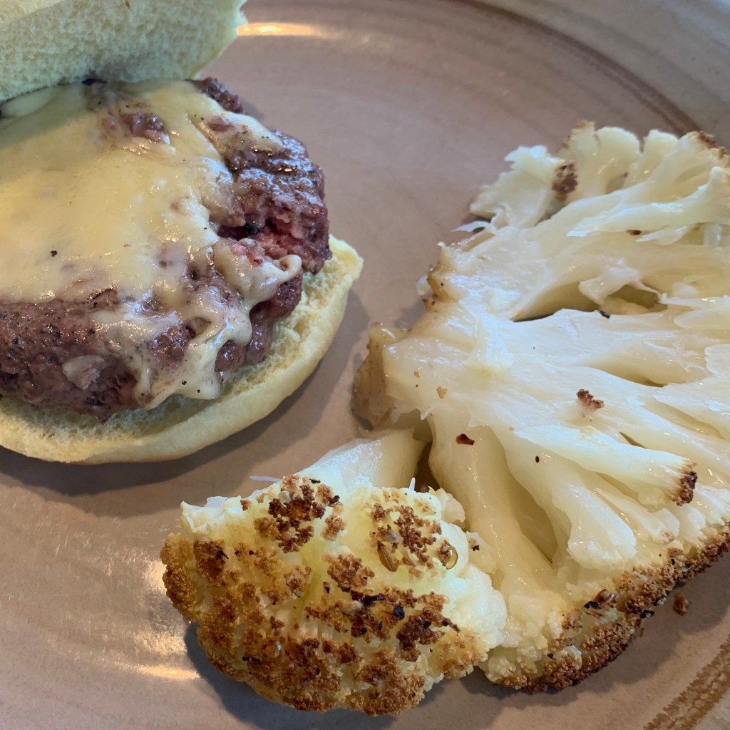 Basically, just cut the leaves and stem and some of the core from a whole head of cauliflower. Wash it, pat it dry, then smear the whole thing with olive oil. Top, bottom, and inside the crevice. Set it, florets up, in a cast iron and season it however you please. I used a basic everyday seasoning. Cover it in tin foil and cook at 375 for 30 minutes. Uncover and cook another hour.