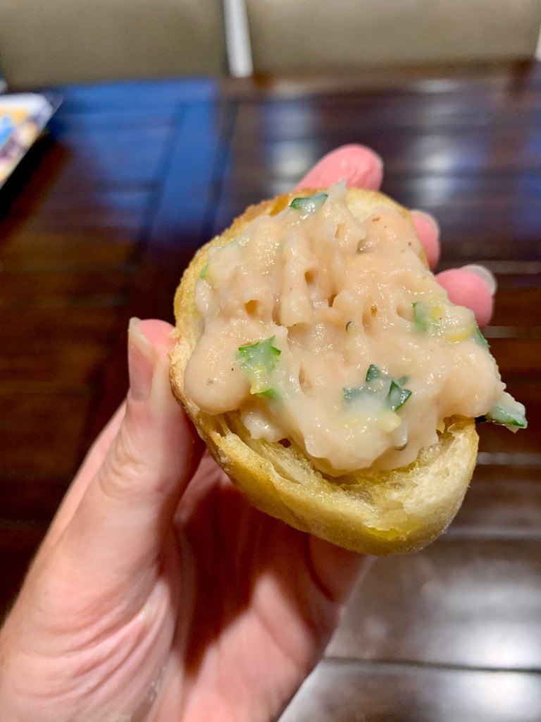 Easiest crostini recipe ever, coming up! I literally found this by googling “easy crostini recipe.” This recipe could not be simpler. Before you make a face, I recognize that this is not the prettiest looking appetizer. Mashed white beans kinda look like dog food. I knowwww. But it tastes really good and is so easy to prepare that you won’t even mind.