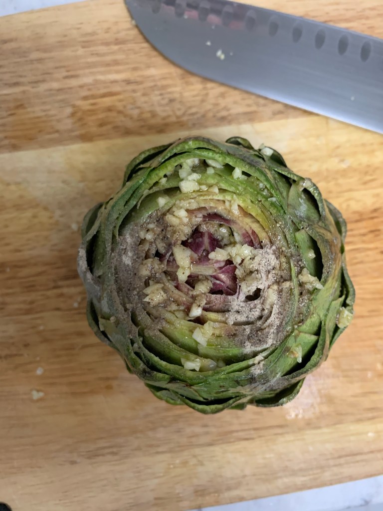 One of my favorite treats as a kid was when my Mom would serve artichokes instead of a salad with supper. I’ve always been too intimidated to try preparing them myself, but it turns out they’re quite simple…they just sit in the oven for a loooong time.