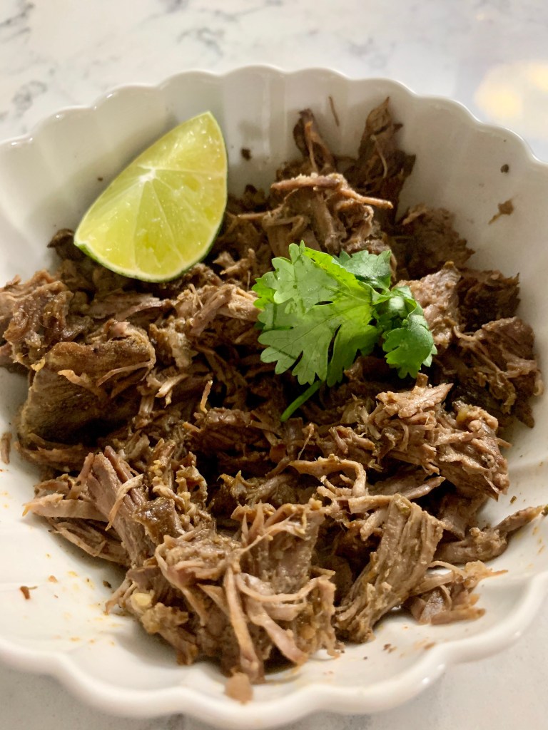 Basically, you’re putting boneless chuck roast in a slow cooker, coating it with spices (salt, chili powder, garlic powder, onion powder, cumin, paprika, and black pepper), and pouring some broth over the whole thing. Let it go in the slow cooker for several hours, then shred it up, squeeze some lime on the top and add some cilantro if you’re so inclined.