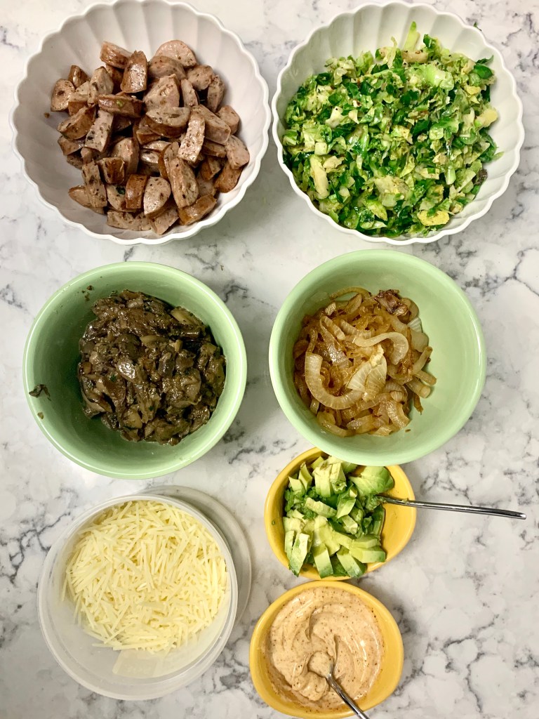 You’re going to use the same pan for each ingredient (because helloooo easy cleanup), but you’ll cook them separately so you can have them in different serving bowls for your buffet style meal. The order of the cooking process will start with the ingredients that take the longest to cook and can be served at closer to room temp. Start by sautéing an onion low and slow. You don’t have to go all the way caramelized, but get em close. I’m going to go spicy(ish) for the rest of the meal so you’ll be happy to get these on the sweeter side for some balance. Set aside. When that’s done, get to sautéing mushrooms and set aside. I used a frozen medley, but fresh work as well. Now, sauté one bag of shredded brussels sprouts with some olive oil, salt, pepper, and crushed red pepper. Set aside. Finally, brown up some sliced chicken sausage (I used a parmesan mushroom variety but any will do) and – you guessed it – set aside. Make a quick aioli by stirring together mayo, grated garlic, and paprika. Serve with some shredded parmesan and avocado.