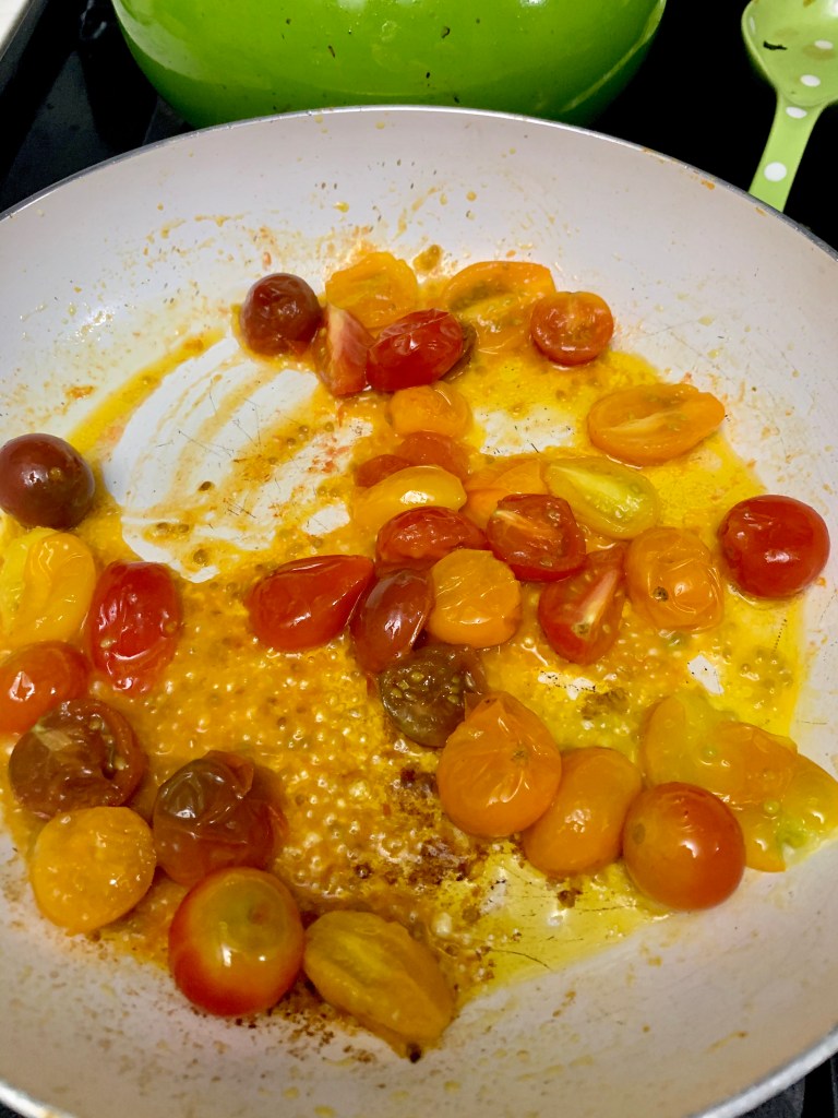 Start by tossing 1 lb shrimp with 2-3 chopped scallions, 1 1/2 tsp aromatic spices (the recipe suggested garam masala, baharat, five-spice, curry powder, or chili powder blend ), 1 1/2 tsp ginger, 2 minced garlic cloves, and salt/pepper. I also added in some crushed red pepper because I wanted this to have a bit of a kick. Which aromatic spice did I use? I went with curry powder because…well it’s pretty much the only one from the list I’d heard of and certainly the only one I had on hand. Set the shrimp aside and start sautéing 3/4 c. grape tomatoes in some olive oil. keep the really tiny ones whole and halve the rest. Stir them around and let them go til they start wrinkling and bursting. Once they’ve released their liquid, add the shrimp mixture and cook for about 2 min per side. Stir in 2 tbsp butter (that’s what’s going to create a luscious lil sauce) and cook for an additional minute before serving immediately. The recipe suggests a squeeze of lime juice and some mint for garnish, but I did none of that and still loved how it came out. I served over cauliflower fried rice to keep everything healthy, but you could serve it over regular rice to really soak up the delicious sauce.