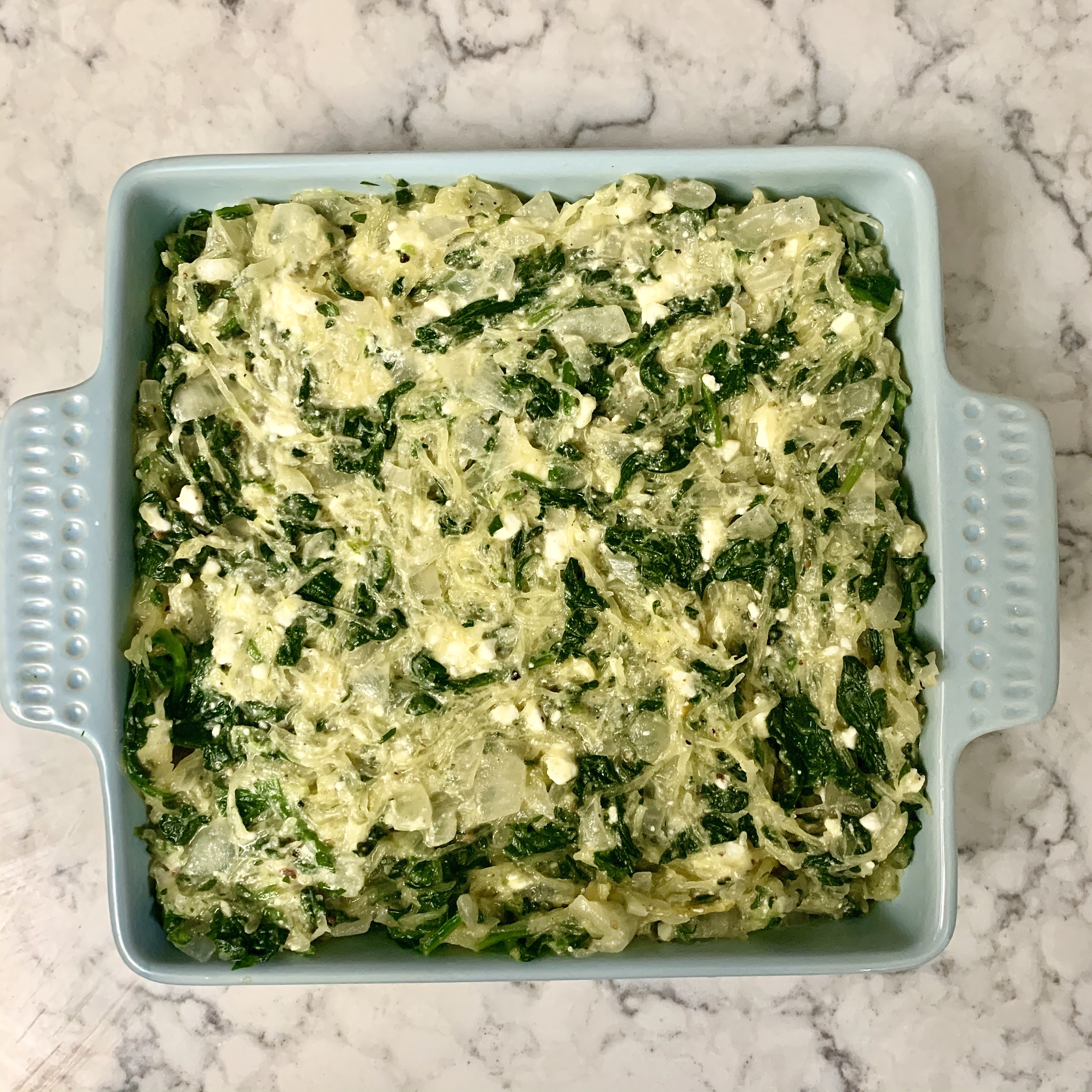 I’m normally all about eating spaghetti squash in their squash boats, but I really liked turning this into a true casserole with a light crust. And that nutmeg! Way back in high school I learned that nutmeg and spinach go well together, but including it here really gave it some Thanksgiving feels. It warmed up the dish and took it into fall territory, where yellow squashes and feta normally feel more summery to me.