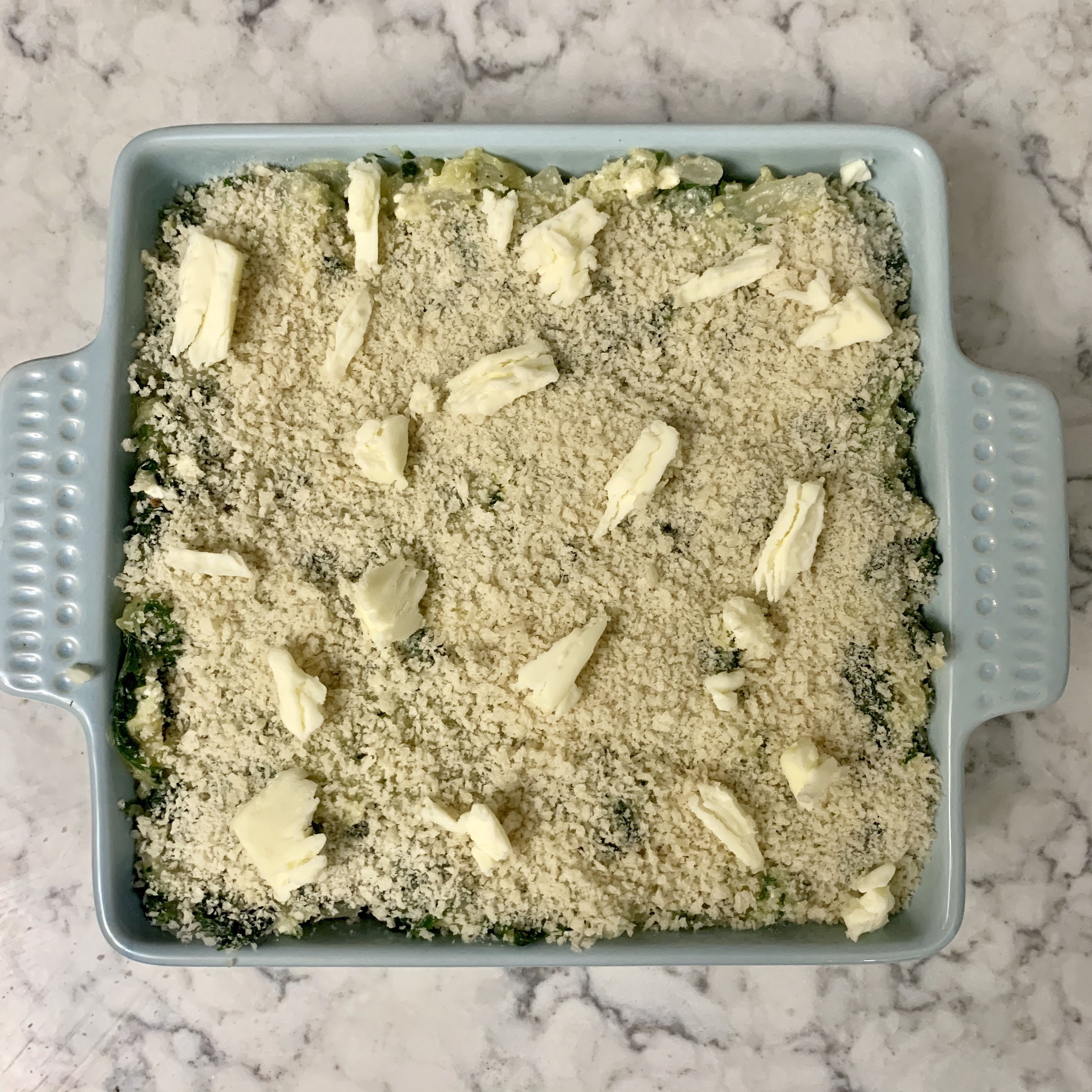 Start by cooking up a spaghetti squash. Poke holes in it and microwave on high for 5 minutes so you can cut it in half lengthwise. Then Scoop out the seeds, add some salt and pepper, and roast at 375 for 40 minutes. While it’s roasting, sauté one onion (or a couple shallots, that would be nice, I bet) in olive oil until they’re translucent. Then add two cloves of minced garlic and sauté for an additional minute. Then add a boatload of fresh spinach. Does it look like too much? Add more. You should know by now that this’ll wilt down to nothing. (Note: The original recipe blanches the spinach and then does an ice bath and that just felt like…a lot of work. So I didn’t do any of that and thought it was great.) Add dried oregano and ground nutmeg and let it go until the spinach has fully cooked down. Let the spinach mixture cool a bit, then turn it out onto a cutting board so you can chop it up. Place it into a mixing bowl, add chopped parsley and crumbled feta. (The original also adds scallions, which I did, but don’t think they’re really necessary, IMO.) When it’s done, scrape the squash into spaghetti-like strands, add it to the bowl, and mix it all together. Pour the mixture into small baking dish and top with panko + a few bits of butter (so that panko browns). Bake in a 350 oven until the top looks all nice.