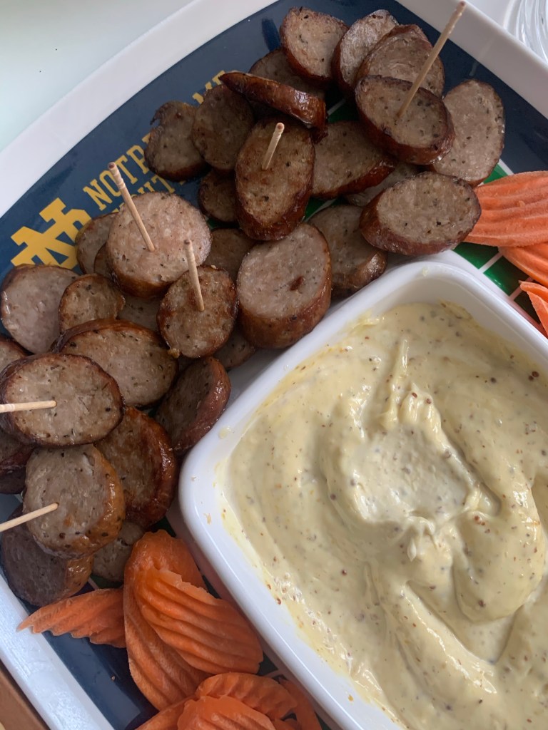 This is very similar to the kielbasa and mustard you’re used to, but just slightly leveled up. Also, the dip works really well with seafood, as I learned when I served it with some bacon-wrapped scallops. It would be great with shrimp. Bottom line, my beau said it was “as good – maybe better” than eating kielbasa at his Mom’s place. That’s all the praise I need.