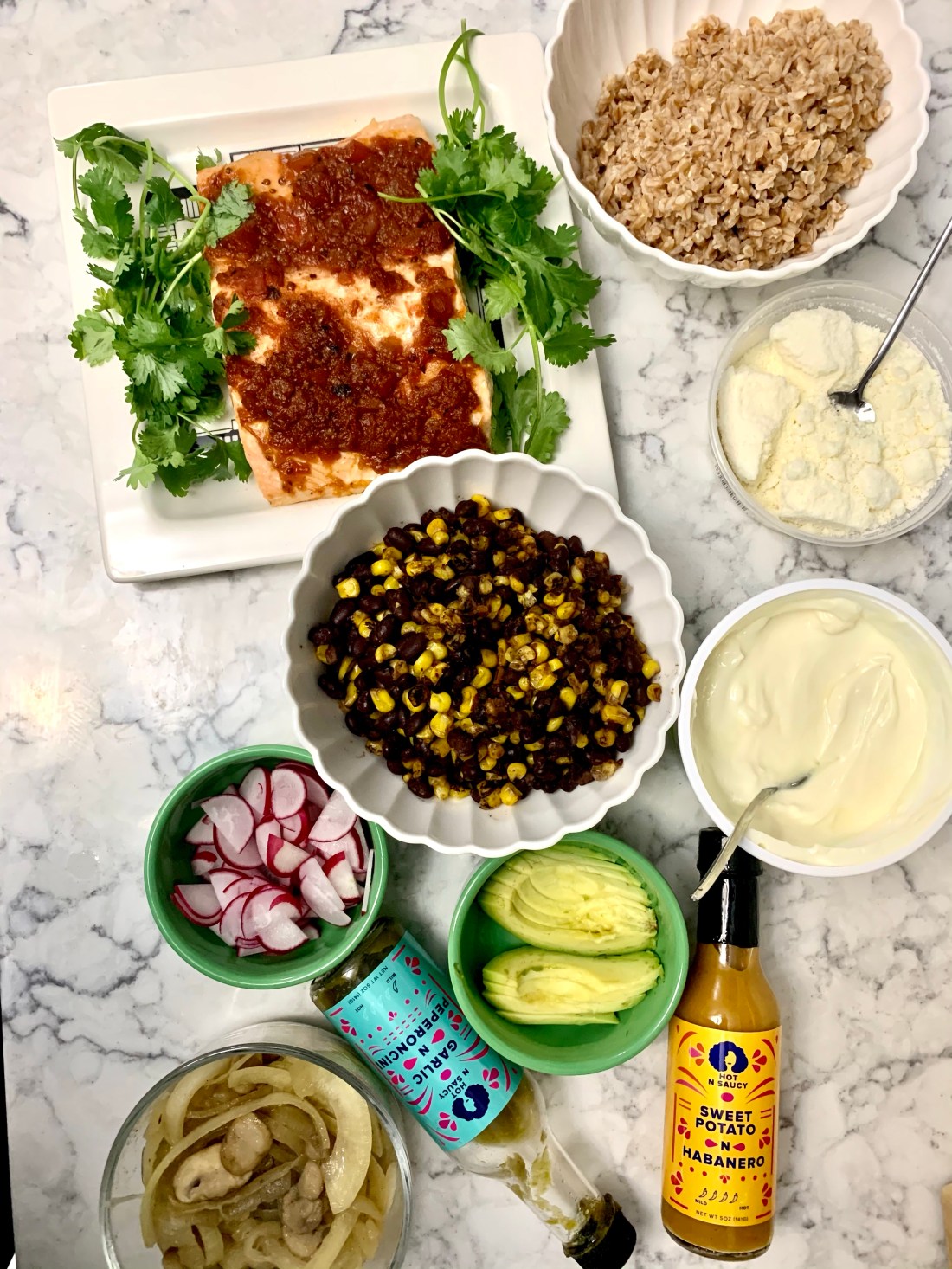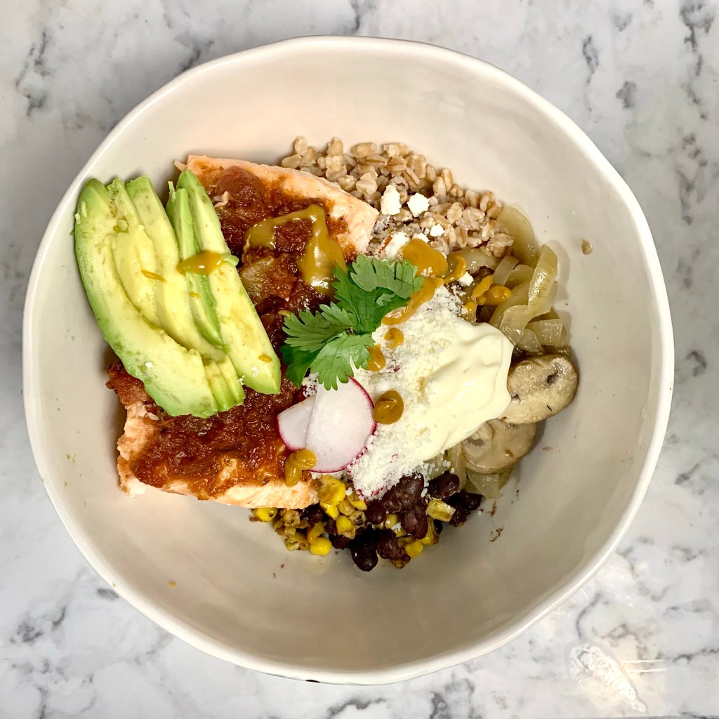 Started by making some quick-cooking farro and, at the same time, sticking 1 lb of salmon in a 400 oven. About 20 minutes later, everything will be done. The salmon prep is extra easy: just pour some of your favorite salsa (I used a Trader Joe’s garlic chipotle salsa, but truly any jarred stuff will work well) over the top along with some salt. Easyyyyy. For the other fixins, I used sour cream, sliced avocado, sliced radishes, some warmed black beans and corn, leftover sautéed veggies (I had mushrooms and onions on hand), cilantro, crumbled queso fresco, and hot sauce. Basically, whatever you’d put on a taco bar.
