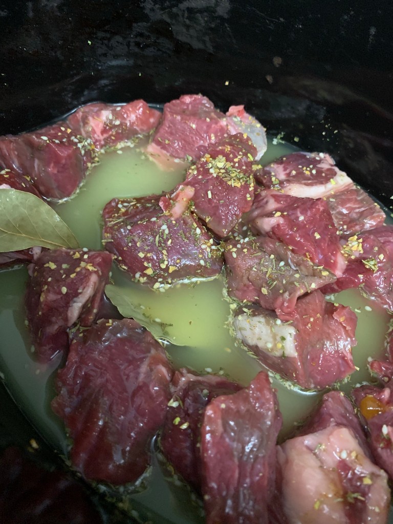 Latkes can’t be the whole meal – you need some protein! I didn’t grow up eating brisket on Chanukah (our meal was always fried chicken, ribs, latkes, and biscuits), but I know it’s a common main course for the holiday. I didn’t feel like making a brisket so I stuck some chuck stew meat in the crock pot for about 4 hours (on high) til it could be shredded/chopped up. To the beef I’d added 2 bay leaves, and garlic, zaatar, dried parsley, celery salt, and stock with honey – all to taste. I was totally winging it with the beef prep but ended up loving the combo. When the meat is about 20 minutes from being done, start frying up your latkes. When you start the latkes, also start caramelizing an onion. When it’s time to assemble the platter, just throw on whatever toppings look good. I made horsey sauce, sour cream with dried dill and everything bagel seasoning, apple sauce, capers, sliced cucumber, and caviar. I don’t like lox, but if I did (or was serving guests who did) I would have included it on this board as well.