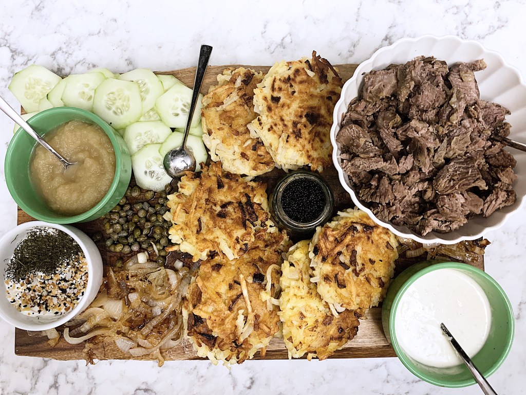 Are you team apple sauce or sour cream? I think apple sauce on latkes is vile, but my beau likes it so I included it. And that’s exactly what makes this latke board so great! everyone can make the kind of latke they like. For one of mine, I did horsey sauce, shredded beef, and caramelized onions; the other was topped with dill/everything bagel sour cream, capers, and caviar. There’s something for any type of latke lover here.