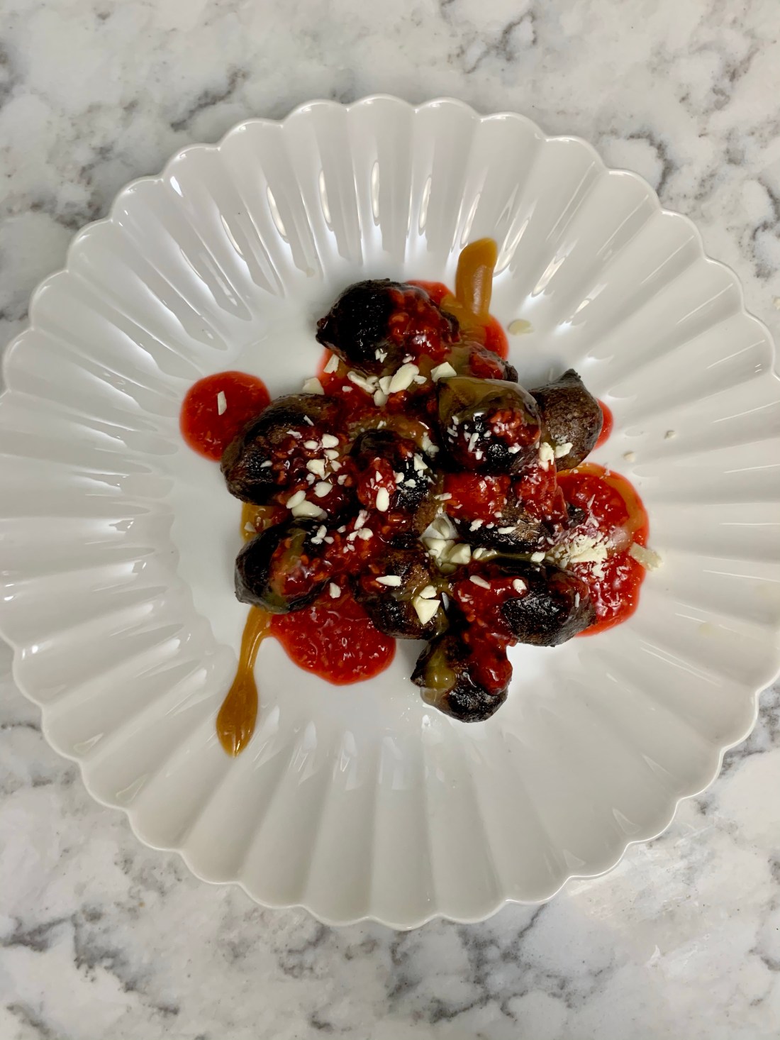 The real hero here is Trader Joe’s new-ish chocolate gnocchi. This is not really gnocchi – it’s like a bunch of little mini teeny weeny molten lava cakes. YES. I would show you a photo of it mid-cook, but the pic was not at all appetizing (they look like lil turds…sorry). BUT that all changes when it’s on the plate. At least an hour or so before you’re ready to eat, prep some raspberry sauce. This will be the “marinara” for your dessert pasta. Cook 1 package of raspberries with a few tablespoons water, sugar to taste, the juice of half a lemon. Bring to a boil and add a thimble of vanilla extract and a little slurry of corn starch. Let it simmer/low boil for another 4 or so minutes to thicken up and then add a pat of butter if you want it extra silky (not necessary). Let that hang out for at least 45 minutes. When you’re ready to eat, cook your “gnocchi” (under 10 minutes). Pile on a plate, drizzle with the raspberry sauce and store-bought salted caramel sauce (this looks like Buddy’s maple syrup) and top with crushed white chocolate (aka your parmesan).