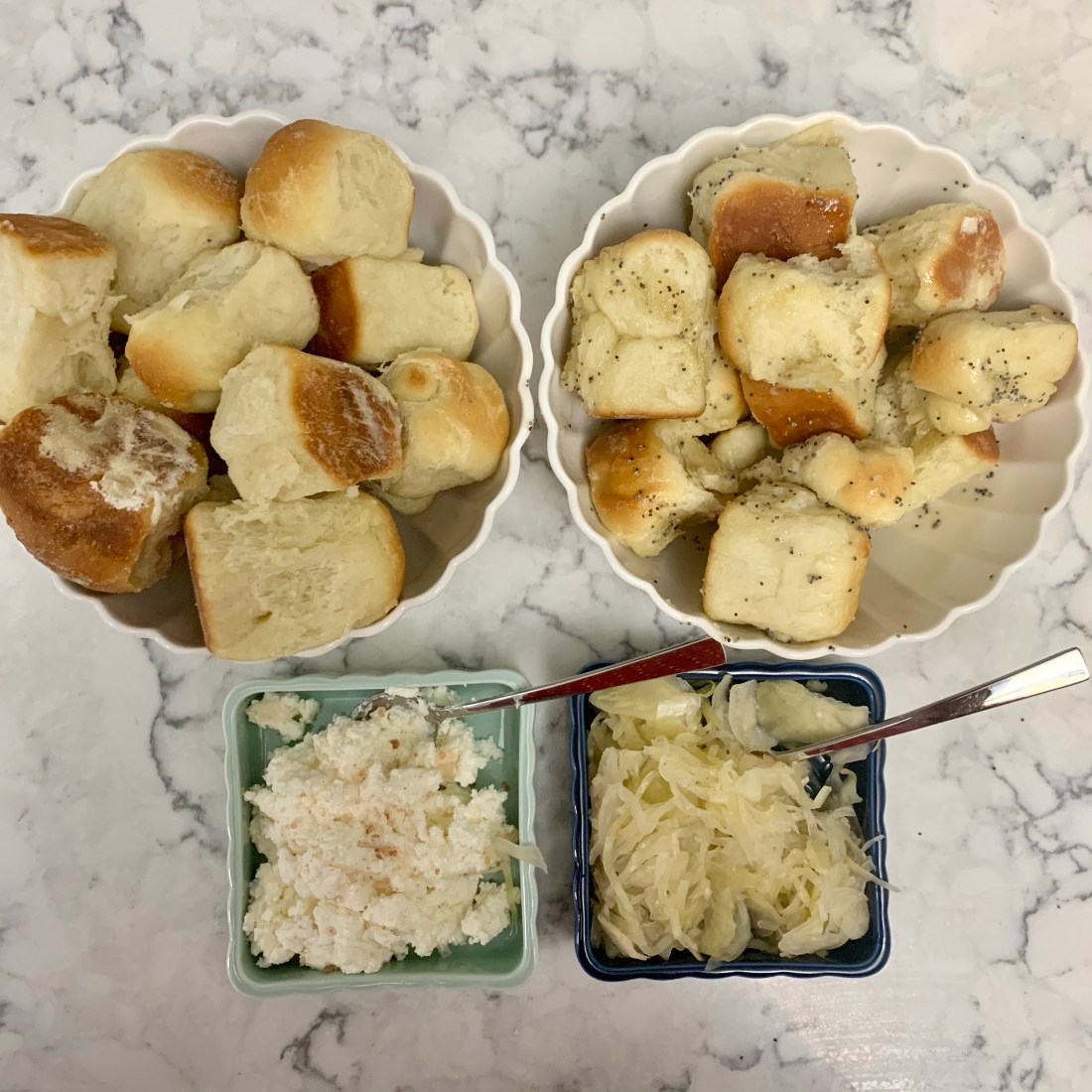 Although we were unable to celebrate Christmas with family this year, I did my best to recreate the magic at home for our little family of two. I paid particular attention to the Xmas Eve meal since that’s where we really stick to tradition year after year. My parents-in-law always create the same [amazing] Slovakian meal. My mother in law calls it carb heaven and if you know me, you know I love carbs so this is a meal I really look forward to each year. The meal begins with appetizers (kielbasa with cheese and shrimp cocktail – I love a snacky moment) and then moves into the main course of pierogi and bobalki. I wasn’t confident enough to take on two new recipes so I bought pre-made pierogis (thank you, Veselka) but made the bobalki from scratch.