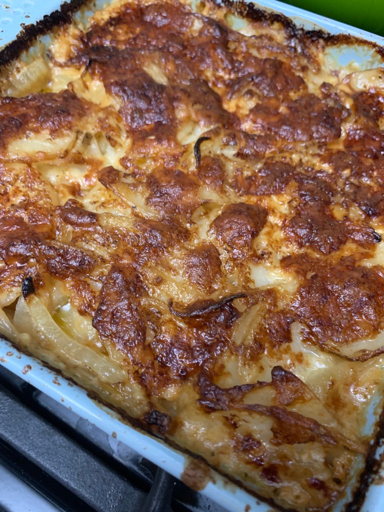 Slice one bulb of fennel in half lengthwise and then slice thinly, like an onion. While you’re at it, do the same to 1/2 an onion. Sauté both the fennel and onion in 1 tbsp olive oil and 1/2 tbsp butter on medium-low heat for 10 to 15 minutes til they’re nice and soft. In a separate bowl, toss the sautéed veggies with two peeled and thinly sliced potatoes, 1½ c. of heavy cream, 1 c. of shredded Gruyère, ½ tsp salt, and ¼ tsp pepper. Pour the mixture into a 9×9 baking dish (I forgot to grease mine and it was totally fine – there’s enough fat in this dish that nothing will stick). Combine the remaining 1 tbsp of cream and ½ cup of shredded Gruyère and sprinkle on the top. Bake at 350 for 1 hour, until the potatoes are tender and the top is browned and bubbly. I may have stuck it in the broiler for just a minute to really get the top lookin nice. Let it set for 10-15 min before serving.