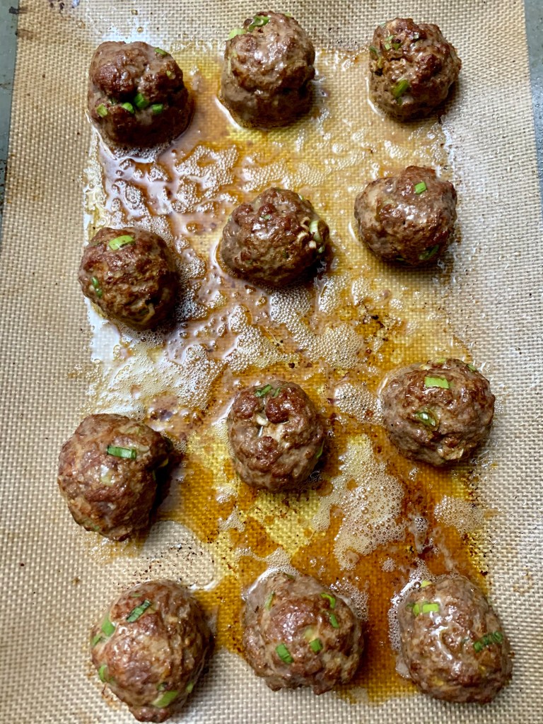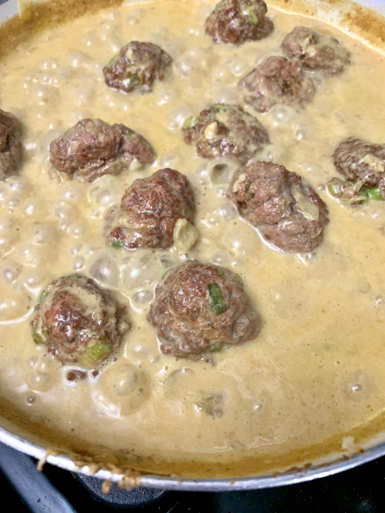 Start by prepping your meatballs. With your hands, mix 1 lb ground beef with 2 tbsp full fat Greek yogurt, 2 chopped scallions, 1/2 tsp chipotle chile powder, and salt and pepper. Roll them into 10 meatballs, place on a silicone-lined baking sheet, and bake at 450 for about 15 minutes. While the meatballs cook, make the sauce by sautéing 1 chopped onion in olive oil til soft, then add 4 minced garlic cloves and some ginger. Once that’s fragrant (a couple minutes), add 1 tbsp curry powder, 1/2 tsp cinnamon, and 1 can coconut milk. Stir it all together and let it simmer until it reduces. Add the meatballs to the sauce, along with the juice of 1 lemon, and toss to coat. Just before serving, top with a generous handful of chopped cilantro. Serve over rice.