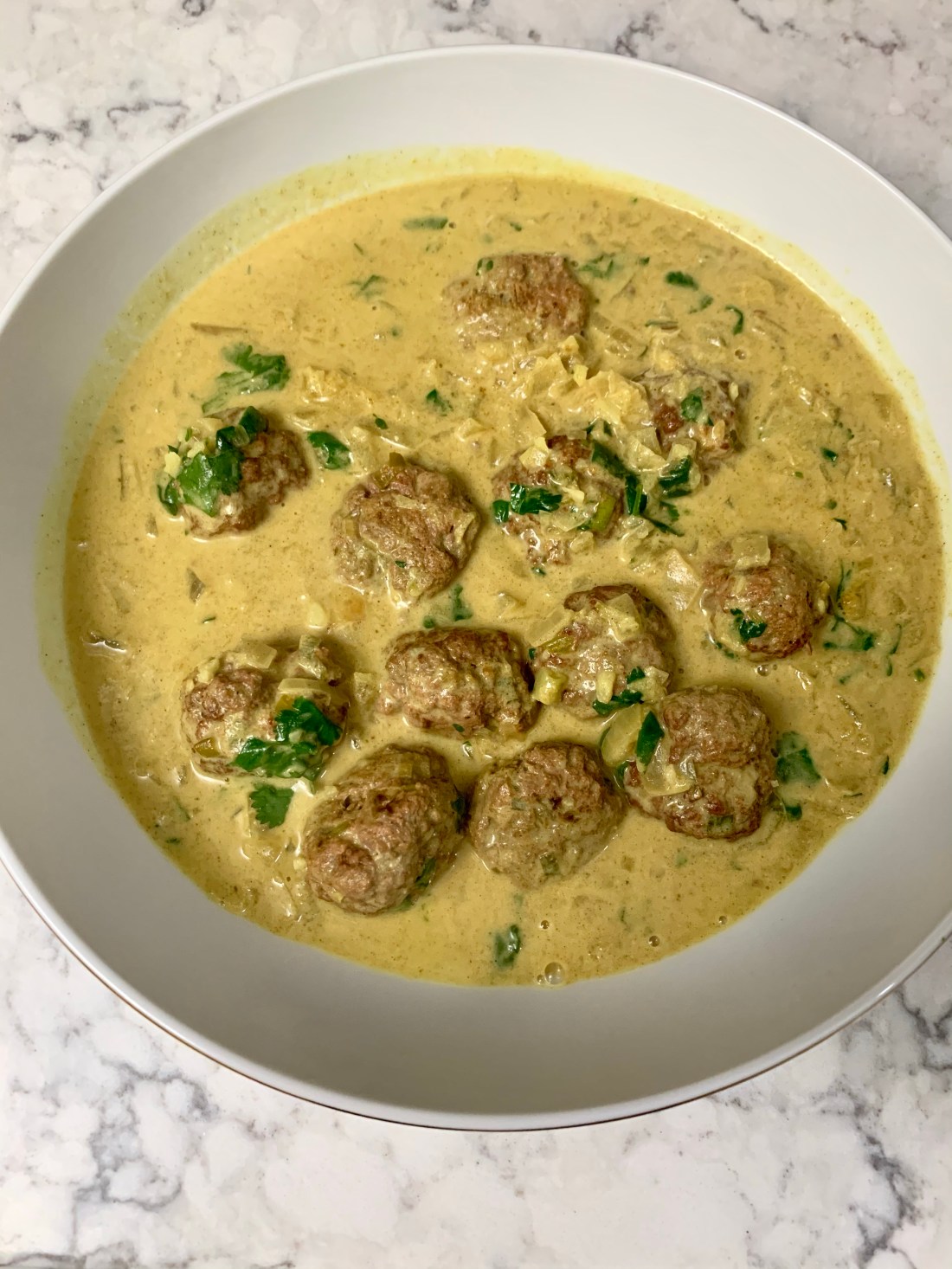 Start by prepping your meatballs. With your hands, mix 1 lb ground beef with 2 tbsp full fat Greek yogurt, 2 chopped scallions, 1/2 tsp chipotle chile powder, and salt and pepper. Roll them into 10 meatballs, place on a silicone-lined baking sheet, and bake at 450 for about 15 minutes. While the meatballs cook, make the sauce by sautéing 1 chopped onion in olive oil til soft, then add 4 minced garlic cloves and some ginger. Once that’s fragrant (a couple minutes), add 1 tbsp curry powder, 1/2 tsp cinnamon, and 1 can coconut milk. Stir it all together and let it simmer until it reduces. Add the meatballs to the sauce, along with the juice of 1 lemon, and toss to coat. Just before serving, top with a generous handful of chopped cilantro. Serve over rice.