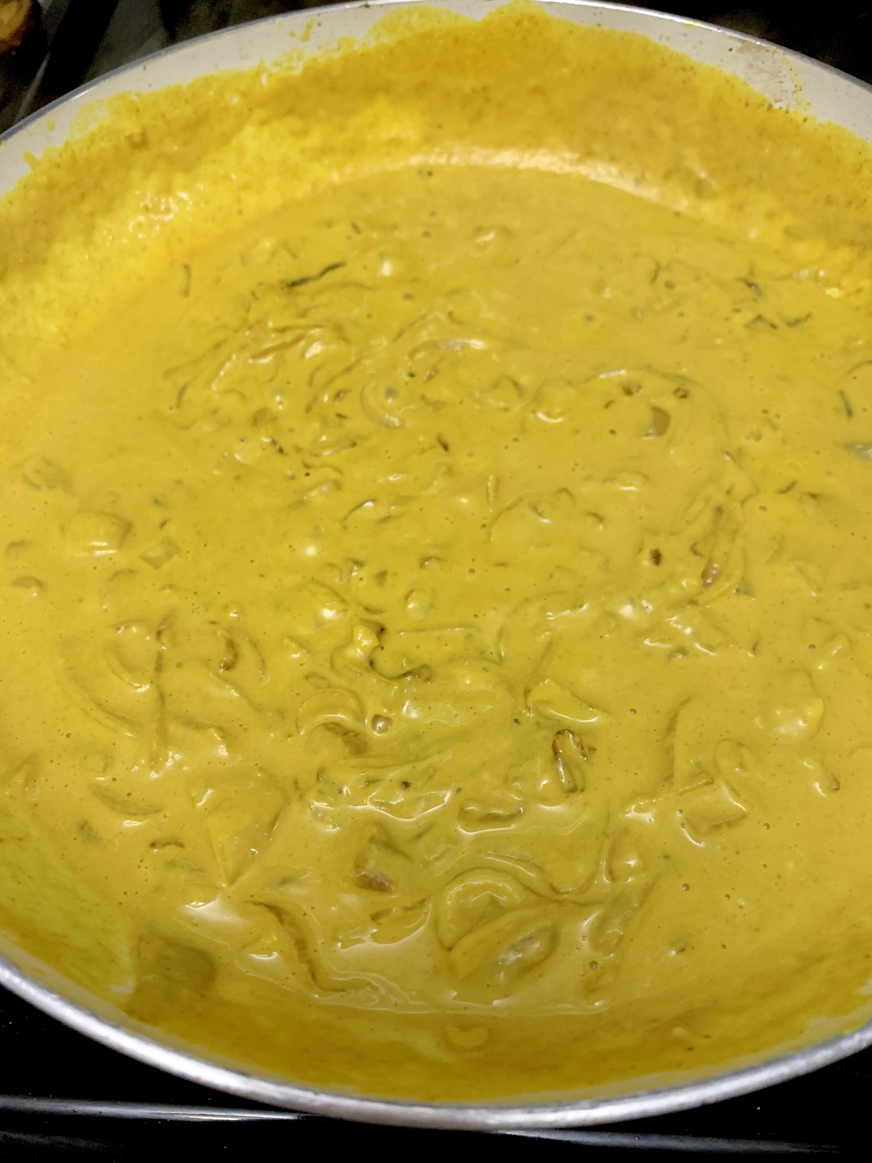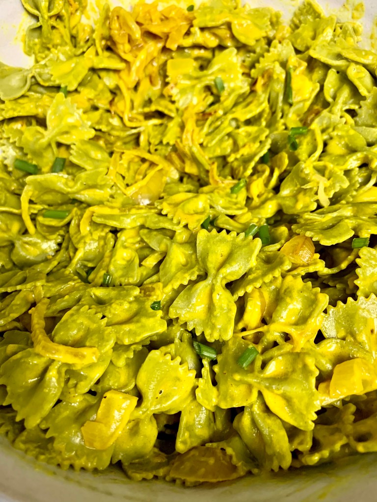 Start by cooking pasta (1 lb). I used a spinach farfalle because it’s what I had and because I knew the orange color of the sauce was bound to pop against the green pasta. Make sure to reserve some of the pasta water (at least 3/4 of a cup) before you drain. While the pasta finishes, make your sauce by melting 2 tbsp butter in a large saucepan over medium heat. Add shallots (I used 2, sliced thin) and 2 cloves of garlic. The recipe called for the garlic to be sliced thin, but I’m not so much into that and instead smashed them so the flavor would still infuse the sauce but I could pull them out. Sprinkle some salt and pepper on there too and cook til the shallots are nice and soft (and browning a bit). Add 1 1/2 tsp of turmeric and stir for about 30 seconds before slowly whisking in 1 c. half-and-half. Bring the sauce to a simmer and whisk in 2 cups Parmesan. Once it’s looking like a real sauce (will happen quickly), add the cooked pasta and the reserved pasta water, as needed. Get all the pasta coated and garnish with fresh chives (or parsley, as the recipe recommends). Serve with more parm because everyone likes more parm.