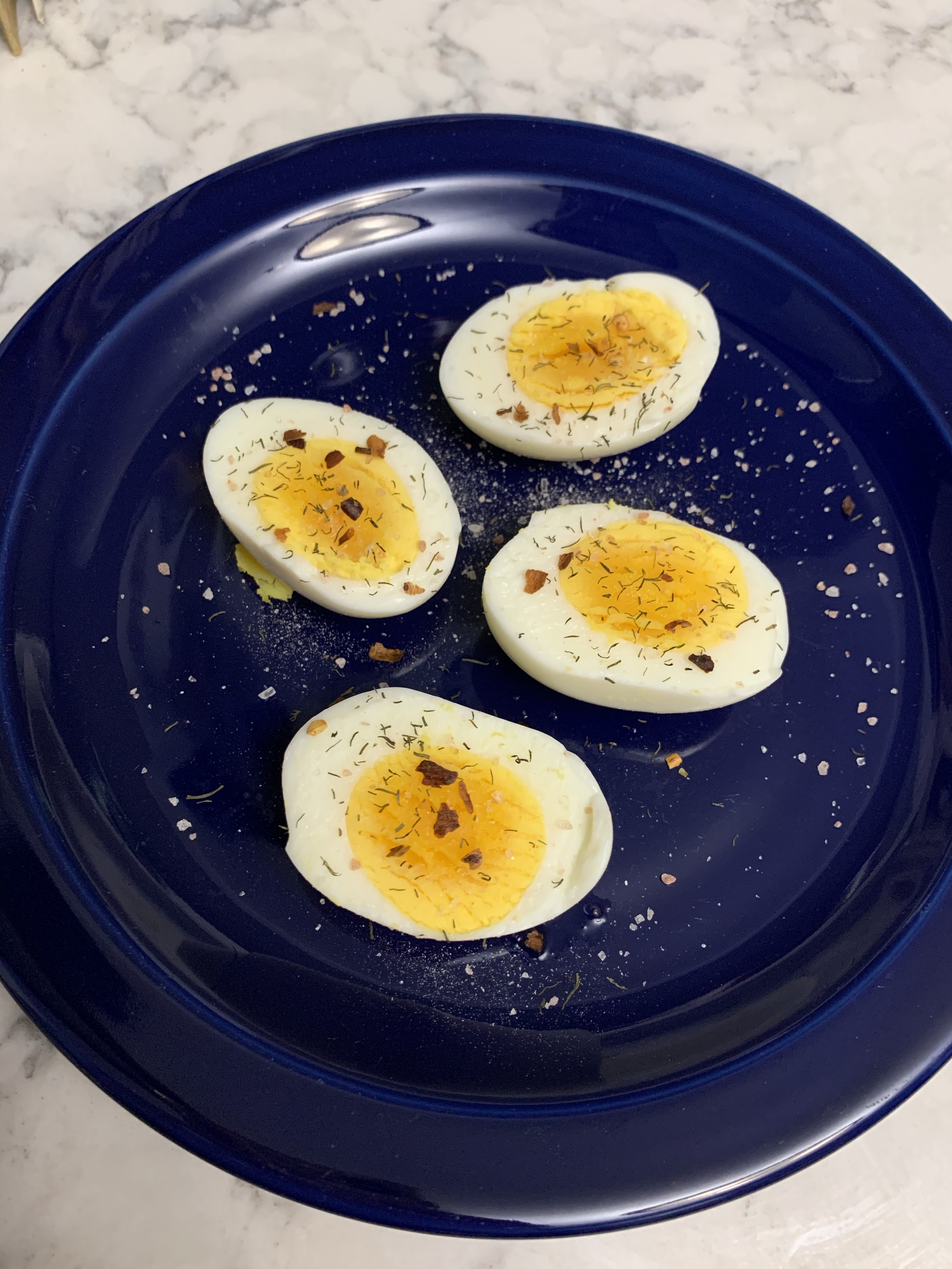 - Hard Boiled Eggs: I don’t like to actually cook anything for breakfast (that’s for the weekends) because I don’t want to have to clean anything. That means I’m not scrambling any eggs. What I will do is hard boil a few eggs the day before (maybe while I’m having lunch or cooking dinner) and stick them in the fridge. The next morning, I’ll slice two of the eggs in half and top with seasonings like dried dill + salt + crushed red pepper flakes.
