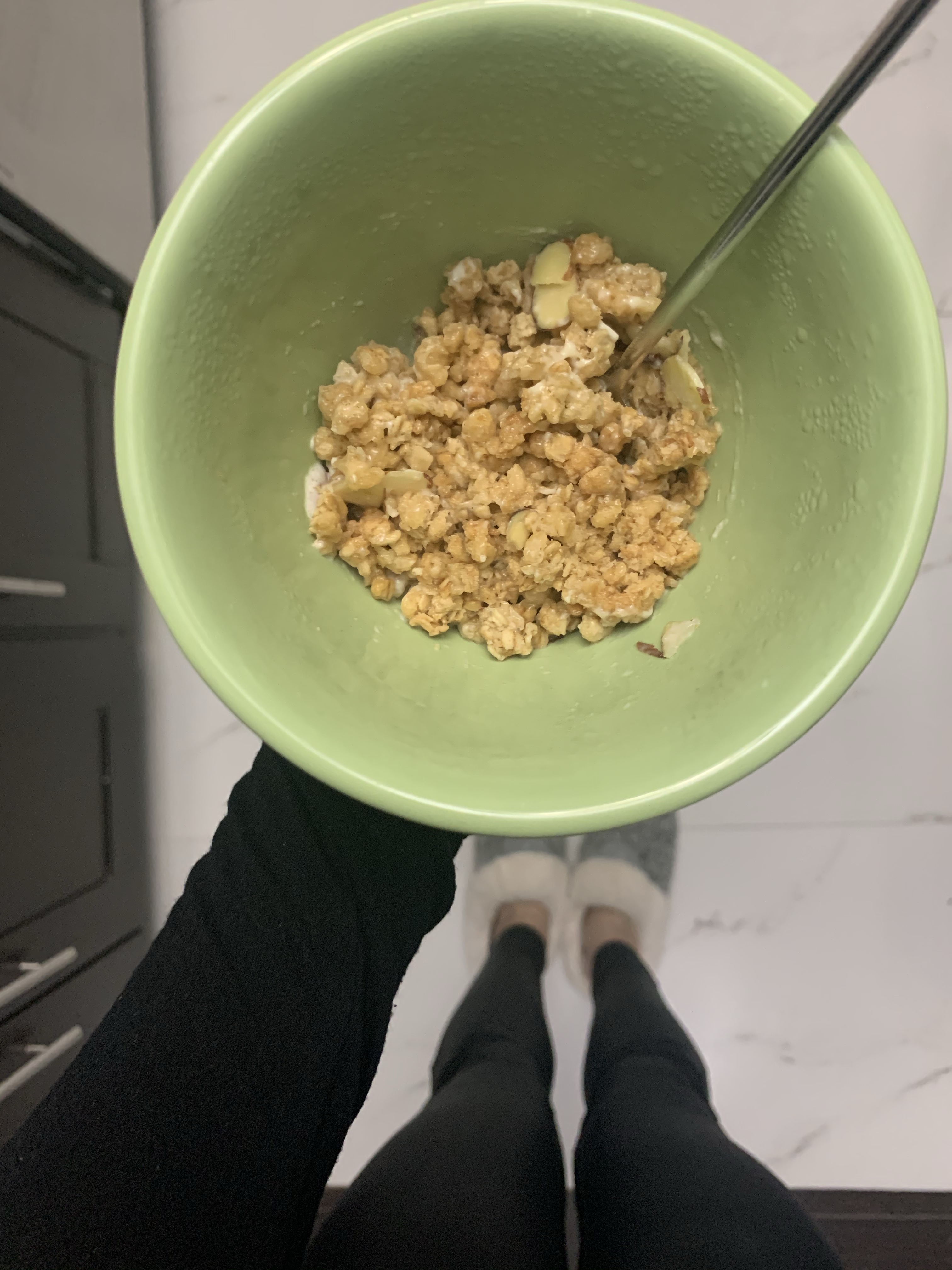- Granola with Milk: I learned the best trick on the side of a Trader Joe’s box of granola! If you microwave 3/4 c. granola with 1/4 c. milk for 1 minute, you basically have oatmeal that’s way quicker to make and [in my opinion] has a much better consistency. I like to top it with berries for even more texture.