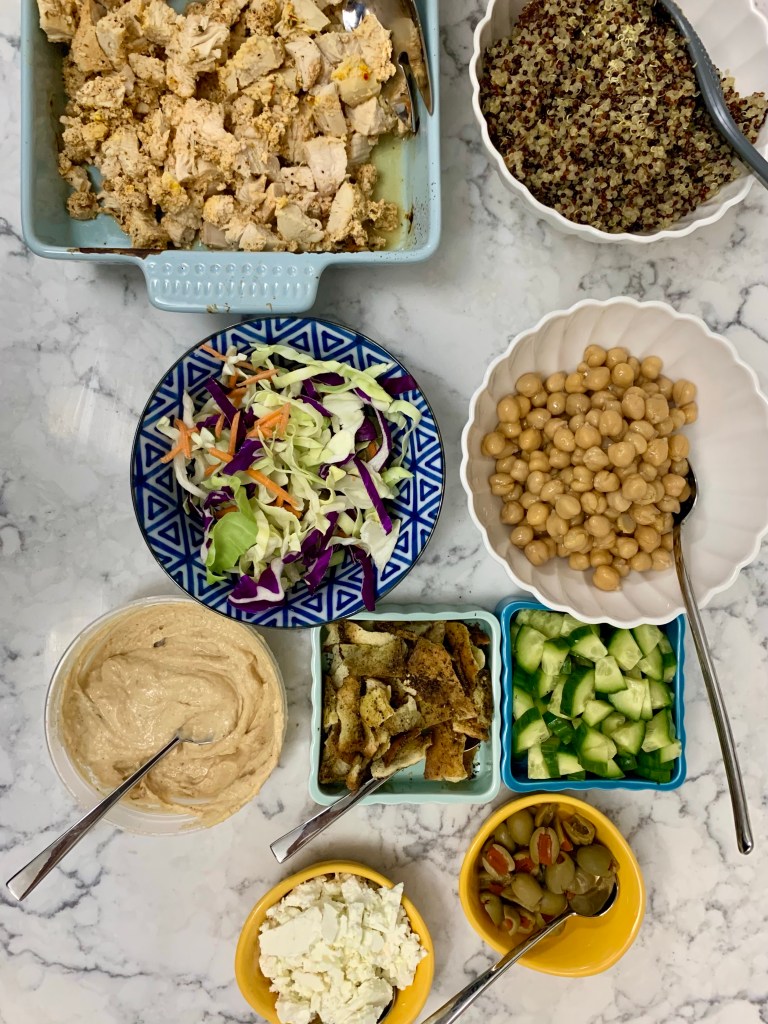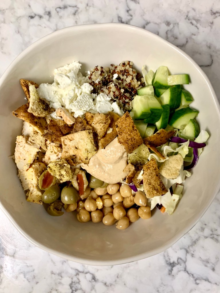 Start by marinating your chicken for at least an hour by placing boneless skinless chicken breasts (I used 2 huge ones) in a ziploc baggie with two plain Greek yogurts and enough kebab seasoning to change the color of the yogurt. Add some salt too. When you’re ready to go, put the yogurt chicken in a baking dish, cover, and cook at 400 for 35 minutes. While the chicken cooks, prepare your quinoa and all your toppings: I used chickpeas (drained and rinsed), slaw mix, chopped cucumbers, crushed za’atar pita chips (regular pita chips are fine), hummus (I used a jalapeño variety), olives, and feta. Chop up the chicken before setting it out on your lil buffet…I mean, you don’t have to, but it’s a good move.