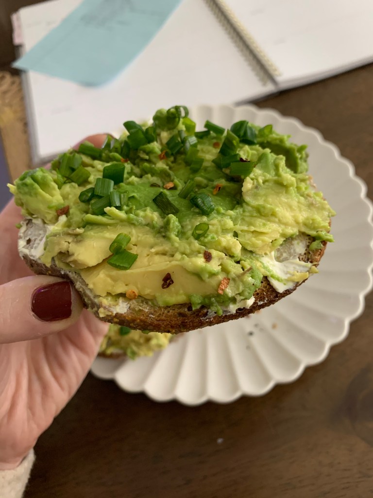 Lunch stock was running low on Tuesday, as was time. I had mere minutes to pull something together and ended up with a pretty legit version of avocado toast. Za’atar bagel, topped with a little light cream cheese, mashed avocado, salt, and crushed red pepper. For not having any meat, it was a surprisingly satisfying meal. Sometimes an unplanned lunch is the best lunch.