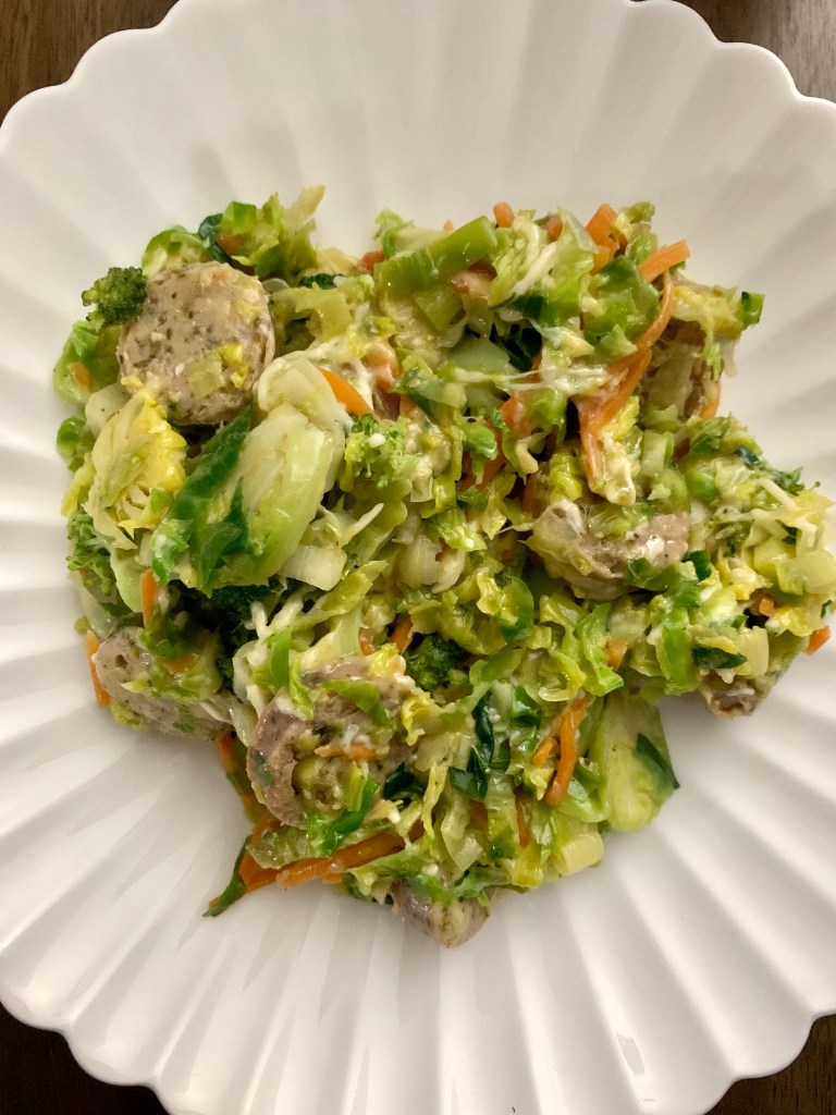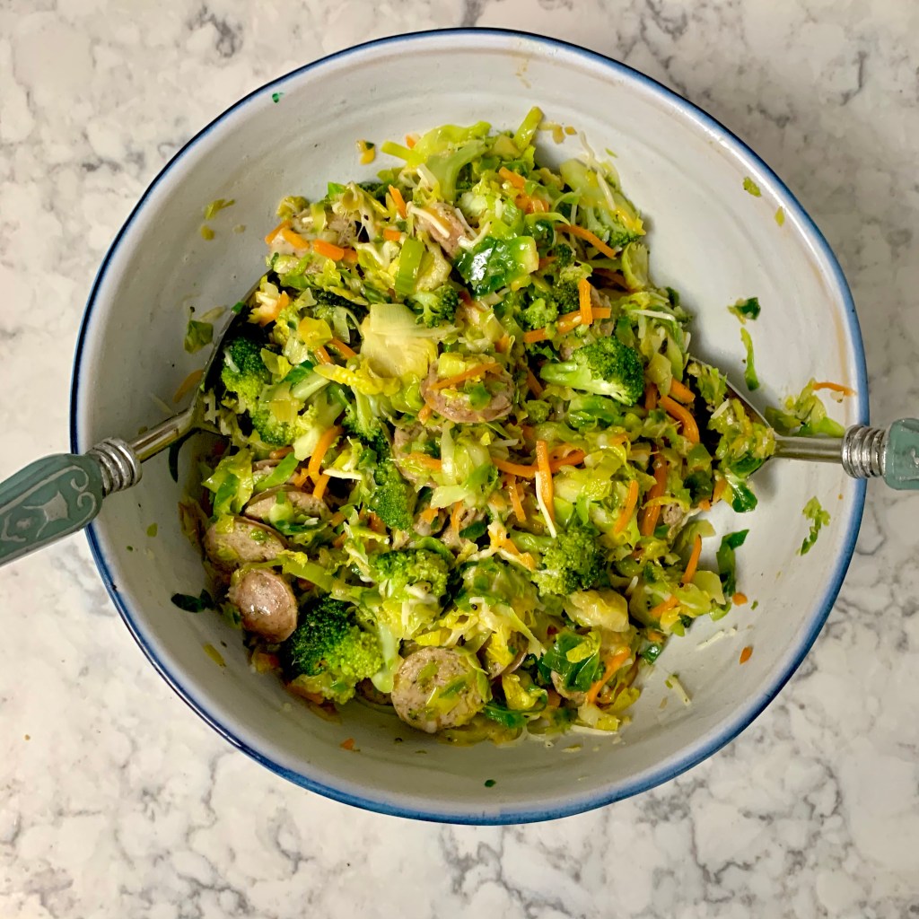 Start by sautéing the florets (chopped) from one head of broccoli in olive oil. After about 2 minutes, add one bag of shredded brussels sprouts and two sliced leeks with some salt, pepper, a dash of paprika, and a bit of cayenne and allow to soften a bit. Add shredded carrots and sliced sausage (the Seemore’s version is ideal, but you could always do this with chicken sausage) and warm everything through. Remove from heat and toss with a mix of shredded cheese blend and shredded parmesan.