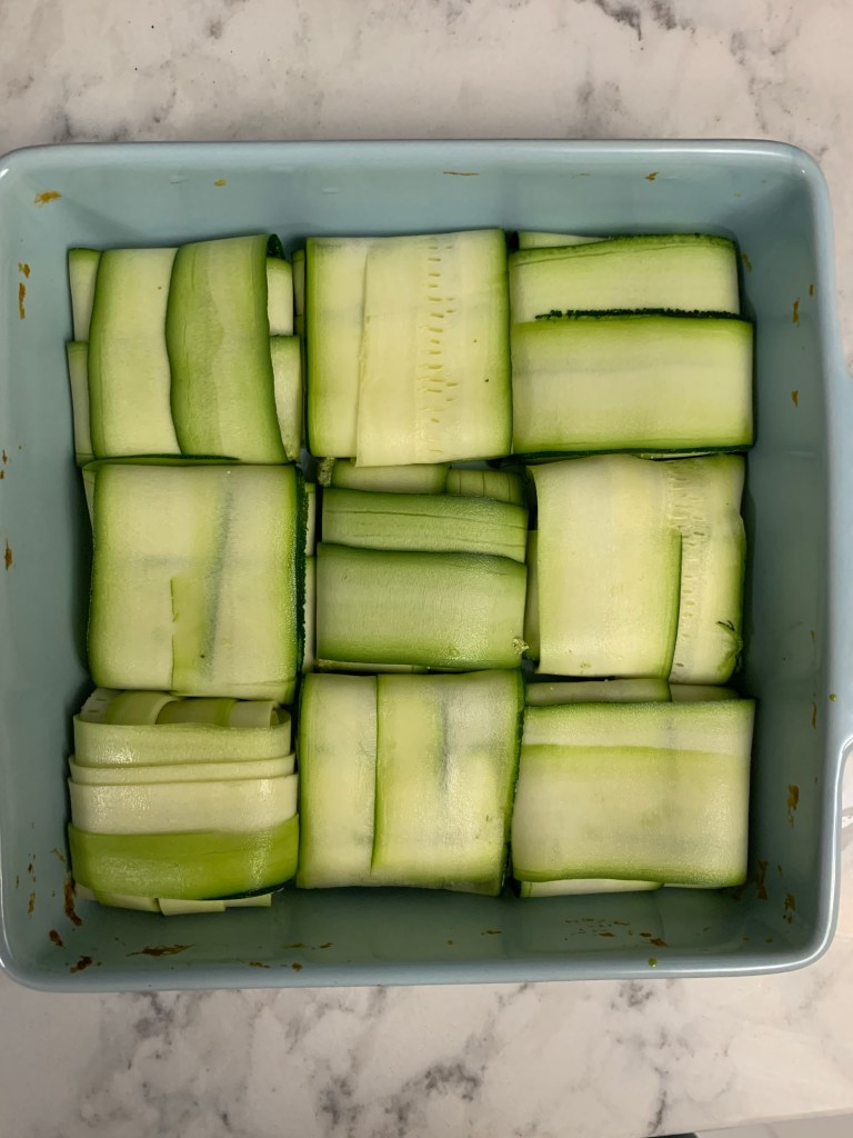 A while ago, blogger Caitlin Covington (of Southern Curls & Pearls) posted zucchini ravioli and I thought it was genius. This is not ravioli filled with zucchini (though I actually think that would be delicious…mental note to create that recipe later); it’s ravioli where zucchini becomes the noodles. What a great way to cut out carbs aka what a great meal for Passover! Her recipe is super easy, but mine is even easier. So easy, in fact, that you can prep, cook, and eat the whole thing during your lunch break if you’re WFH.