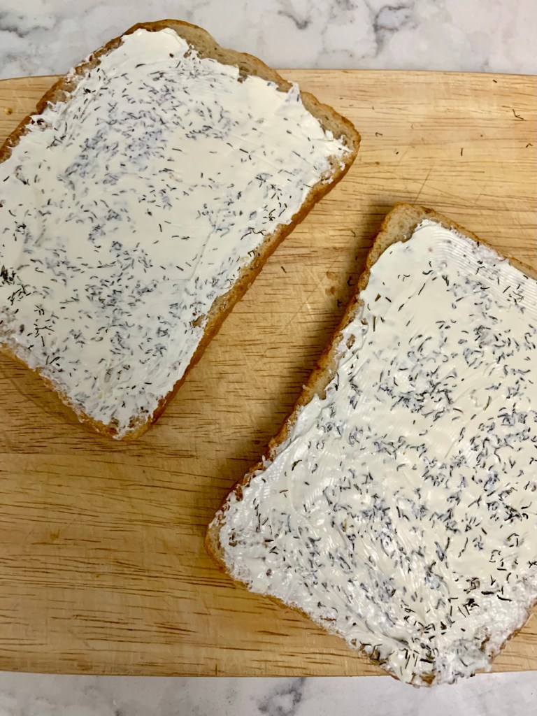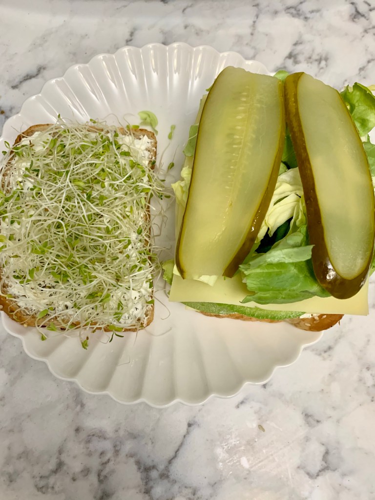 Start by spreading two slices of multigrain bread with cream cheese and sprinkling with dill (fresh or dried – either works). Next, start piling. The trick is to order the ingredients so they stick to some of the others and don’t go slipping and sliding everywhere. This order worked for me – my sandwich resulted in little mess. On one side of the bread, stick a bunch of sprouts to the cream cheese (this will be your top piece of bread. Build the rest on the other slice in the following order, from bottom to top: swiss cheese, sliced green tomato, half an avocado (mash a bit if possible), more swiss cheese, lettuce (I used butter lettuce), and sandwich pickles. Close up the sandwich, slice in half, and enjoy.